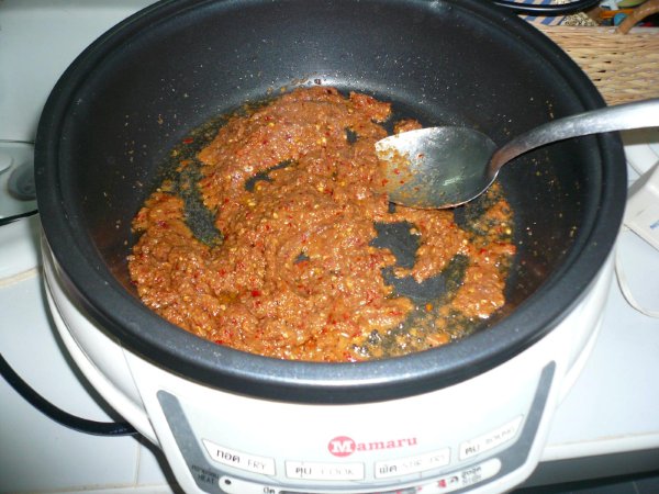 เริ่มทำเลยดีกว่านะคะว่าไปตามรูปเลยละกันนะคะ เทน้ำมันนิดหน่อยใส่กะทะแล้วเอาเครื่องแกงลงไปผัด ๆ ก่อนเล้ย...เอาแบบพอเริ่มจามก็กำลังดีค่ะ....ถ้าไม่จามเดี๋ยวไม่อร่อย หุ ๆ ๆ