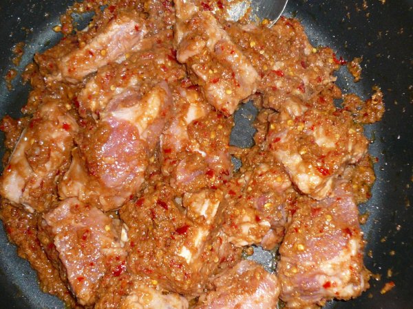 เอาซี่โครงหมูใส่ลงไปในเครื่องแกงทีกำลังผัดจนหอมคลุก ๆ ๆ จนซี่โครงมันเริ่มตึง ๆ แบบในรูปจ้า....