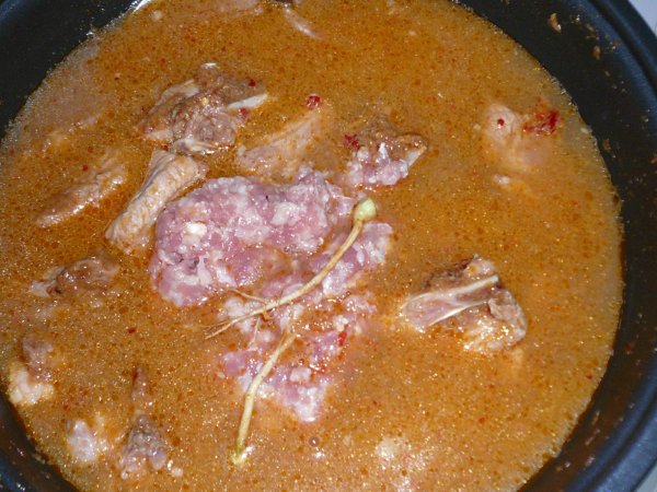 ซี่โครงตึงได้ที่ก็เติมน้ำลงไปเลย....ไม่ต้องรอให้น้ำเดือดนะคะเอาหมูสับใส่ลงไปแล้วคน ๆ ให้หมูสับกระจายตัวในน้ำแกงจะได้น้ำแกงข้น ๆ หน่อย อ้อ...พอดีมีรากผักชีอยู่เลยโยนลงไปด้วยสองสามอัน