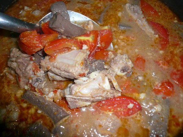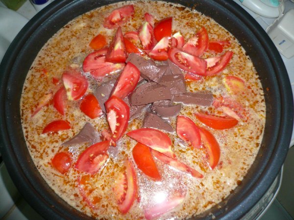 ต้มซักหน่อยพอเริ่มเดือดก็ใส่เลือดไก่ที่หั่นไว้แล้ว กับมะเขือเทศที่เตรียมไว้ลงไป