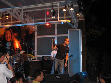 ทีนี้ ลองดูในสังคมใหญ่ พอดี วันที่ ๒๖ ที่ผ่านมา ได้มีโอกาสไปดูคอนเสิร์ต "ป้าง" (ในรูป เจ้าของเพลง โปรดผม หัวล้านใจน๊อย....น้อย) ที่สวนอาหารแห่งหนึ่ง ใกล้ๆ บ้าน ตอนที่ผู้ช่วยเหลือ เข็นรถเข็นผม เข้าไป เหมือนกับที่ชุมชน เกือบทุกที่ครับ....