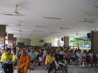 คนมาร่วมงานเยอะมาก จนเต็มสถานที่จัดงาน ที่อยู่ใต้อาคารเรียนใหม่ ของโรงเรียนอาชีวพระมหาไถ่ พัทยา(โรงเรียนนี้ สำหรับคนพิการเท่านั้น นะครับ) ที่นั่น มีพัดลมติดเพดานอยู่หลายตัว แต่ช่วยอะไรผม ไม่ค่อยได้นัก เพราะลมที่พัดมา เป็นลมร้อน แล้วลมธรรมชาติก็แทบไม่มีเลย อากาศจึงร้อน อบอ้าว มากๆ