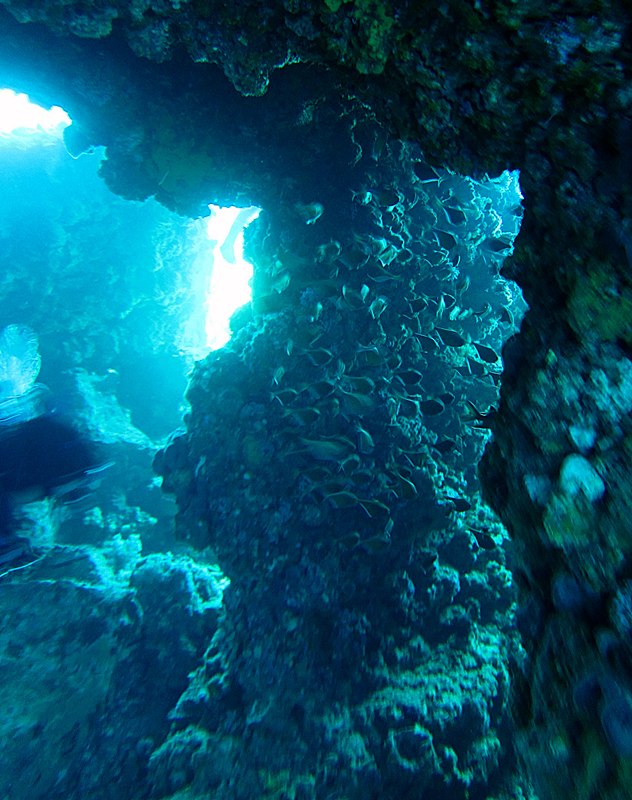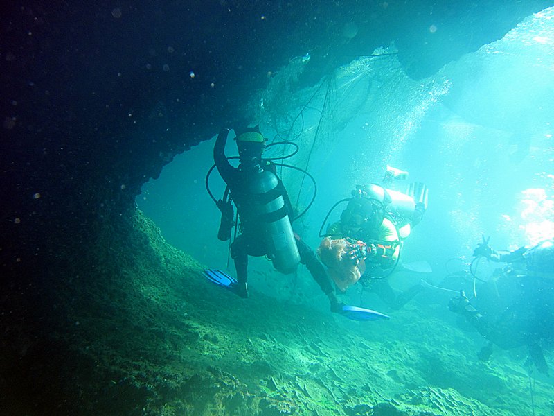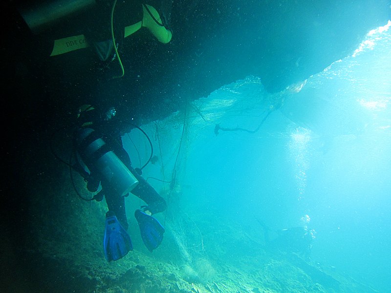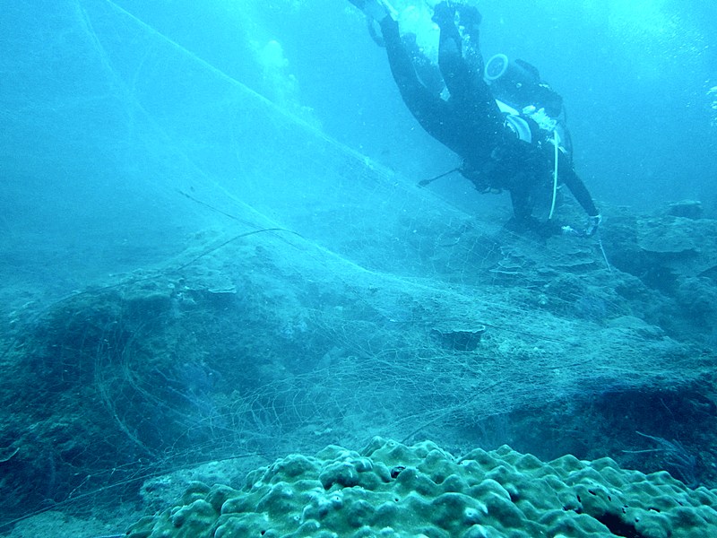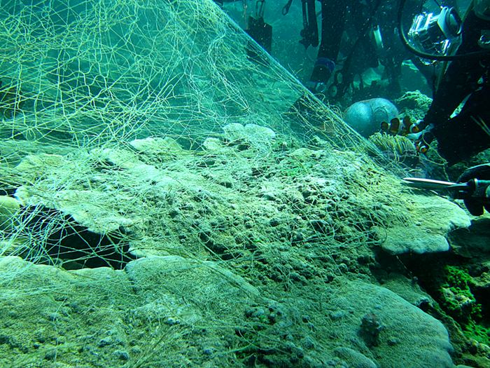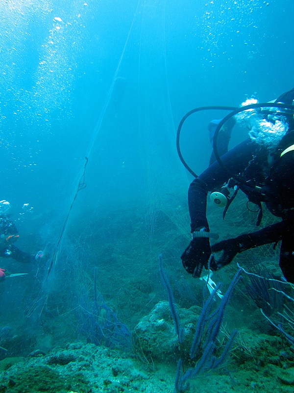 อวนบางส่วน ลอยมาเกาะพันอยู่กับใต้ชะง่อนหินในน้ำ ต้องเข้าไปตัดแบบอวนอยู่เหนือหัว