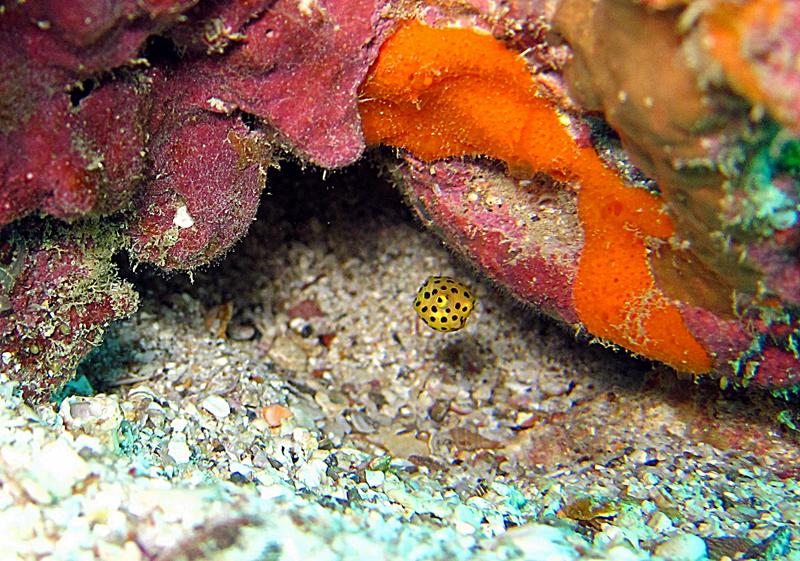 Yellow boxfish ตัวเล็กมากๆ ขนาดเท่าปลายนิ้วก้อย ถ้าเทียบสัดส่วนกับตัวโตข้างบน จะเห็นว่า ตามีขนาดใหญ่มาก และปากเล็กนิดเดียว เกือบมองไม่เห็น
