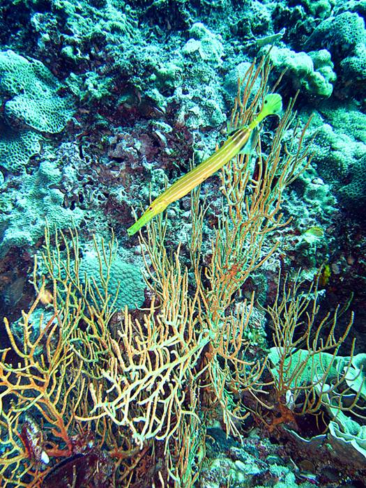 ปลาปากแตรสีเหลือง Trumpet fish พรางตัวให้เข้ากับกอกัลปังหา