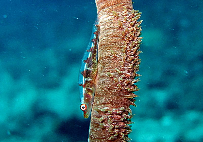 Seawipe goby เกาะอยู่บนแส้ทะเล