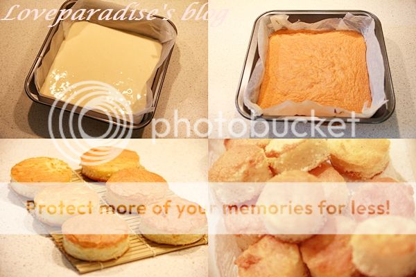 1recipe ............................ Soft sponge cake 8-9 ................................... สตรอเบอรี่ลูกเล็ก .......................................... แป้งข้าวโพด (Corn starch) สำหรับโรยกันติด