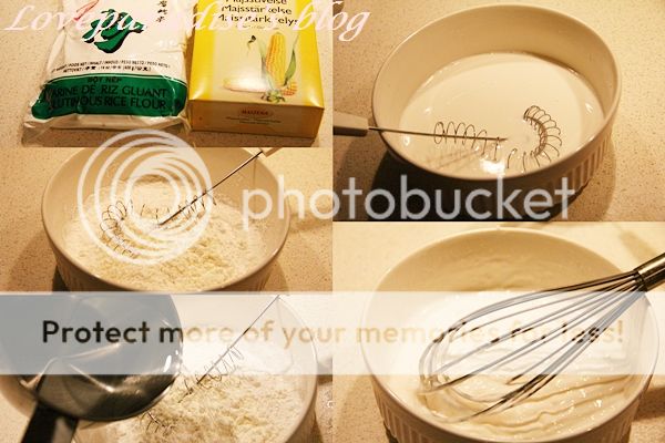 ผสมแป้งข้าวเหนียว แป้งข้าวโพด และน้ำตาลเข้าด้วยกัน แล้วค่อยๆเทน้ำลงไป ผสมให้เข้ากัน