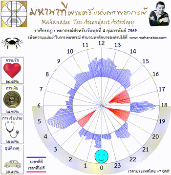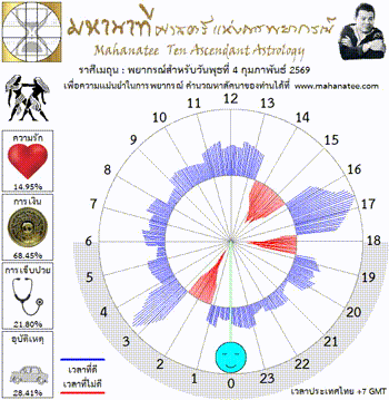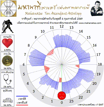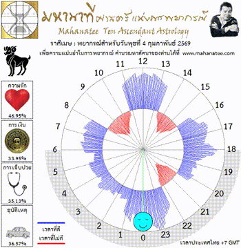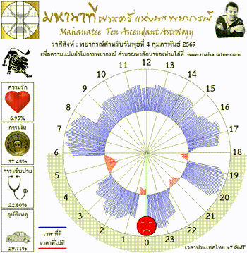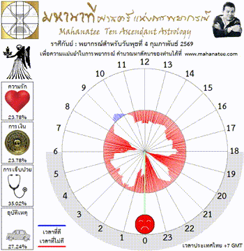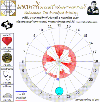 แผนภูมิและพยากรณ์ 12 ราศี สำหรับ วันพุธที่ 4 กุมภาพันธ์ 2569 เลื่อนไปหาราศีที่ต้องการ และเปิดเสียงด้วย ** หมายเหตุ คลิปจะเล่นได้ 3 วันก่อนวันที่พยากรณ์