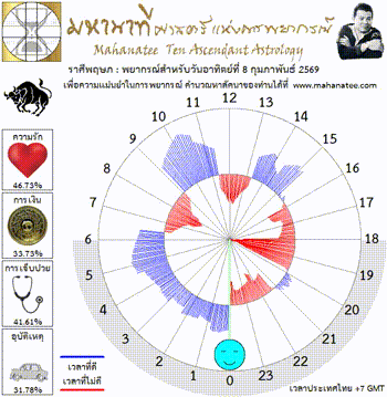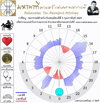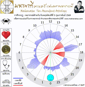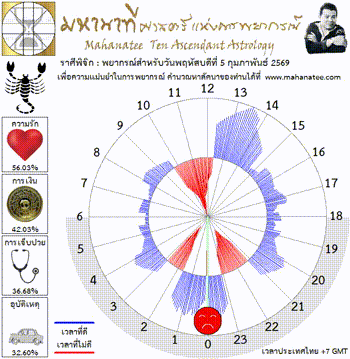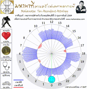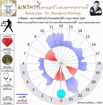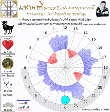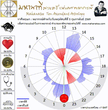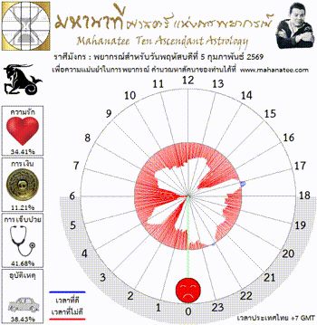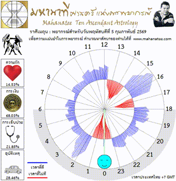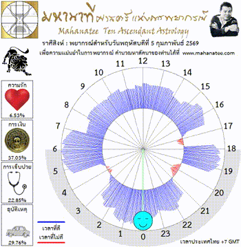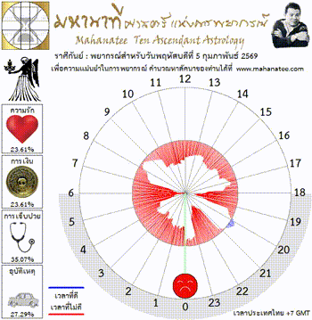 แผนภูมิและพยากรณ์ 12 ราศี สำหรับ วันพฤหัสบดีที่ 5 กุมภาพันธ์ 2569 เลื่อนไปหาราศีที่ต้องการ และเปิดเสียงด้วย ** หมายเหตุ คลิปจะเล่นได้ 3 วันก่อนวันที่พยากรณ์