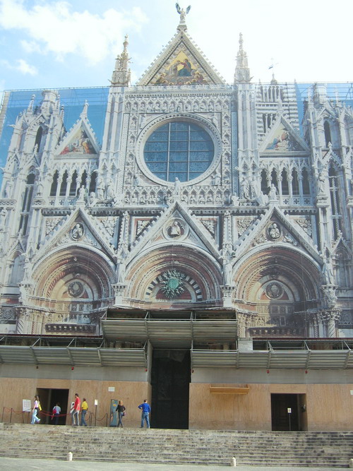 ด้านหน้า Duomo นั้นใช้หินสีเขียว ชมพู และ ขาวเป็นวัสดุที่ใช้ในการก่อสร้าง ส่วนด้านในใช้หินสีดำกับขาวปูเป็นรูปเรขาคณิต และทำเป็นรูปนิทานสอนใจ ตลอดจนการเล่าเรื่องในพระคัมภีร์ใหม่ นี่ค่ะ ภายในDuomo  สิ่งที่ถือว่าเป็นที่โดดเด่นของการตกแต่งภายในของที่นี่ก็คือ inlaid marble floor เป็นการนำหินอ่อนมาตัดแต่งและทำให้เกิดรูปต่างๆเป็นรูปที่แสดงถึงประวัติศาสตร์และพระคำภีร์ค่ะ นี่ค่ะแผนผัง แสดงพื้นโบสถ์ มีตั้ง 56 รูปค่ะ