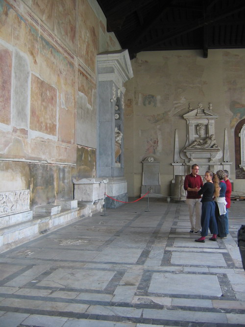 โดย หอเอน--โบสถ์--Baptistry อยู่เรียงกันตรงกลางสนาม ค่ะ แนวตึกด้านบน เป็น ticket office แนวตึกด้านล่าง เป็นที่ให้ฝากของ มุมล่างขวา คือ Cemetry ส่วน Muesum จะไม่เห็นในรูป แต่จะอยู่ด้านซ้ายออกไปอีกค่ะ