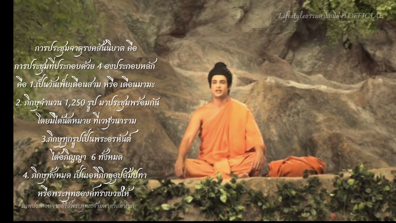 การประชุมจาตุรงคสันนิบาต คือการประชุมที่ประกอบด้วย 4 องประกอบหลัก คือ1.เป็นวันเพ็ยเดือนสาม หรือ เดือนมาฆะ 2. ภิกษุจำนวน 1,250 รูป มาประชุมพร้อมกันโดยมิได้นัดหมายที่เวฬุวนาราม3.ภิกษุทุกรูปเป็นพระอรหันต์ ได้อภิญญา 6 ทั้งหมด 4. ภิกษุทั้งหมด เป็นเอหิภิกขุอุปสัมปทา หรือพระพุทธองค์ทรงบวชให้ อภิญญา 6 มี 6 อย่าง คือ1. อิทธิวิธี แสดงฤทธิ์ได้ เช่น ล่องหนได้ เหาะได้ ดำดินได้2. ทิพยโสต มีหูทิพย์3. เจโตปริยะญาณ กำหนดรู้ใจผู้อื่นได้4. ปุพเพนิวาสานุสติญาณ ระลึกชาติได้5. ทิพยจักขุ มีตาทิพย์6.อาสวักขยญาณ รู้การทำอาสวะให้สิ้นไป ปฏิสัมภิทาญาณ 4 คือ1.อัตถะ ปฏิสัมภิทาญาณ2. ธัมม ปฏิสัมภิทาญาณ 3. นิรุตติ ปฏิสัมภิทาญาณ 4.ปฏิภาณ ปฏิสัมภิทาญาณ หลักการ 3 คือหลักการของพุทธศาสนาโดยย่อ คือ1. การไม่ทำบาปทั้งปวง2.การทำกุศลให้ถุงพร้อม3.การทำจิตใจให้บริสุทธิ์ อุดมการณ์ 4 ที่แตกต่างจาดศาสนาอื่น ได้แก่1. ขันติ คือ ความอดทนอดกลั้น 2.นิพพานเป็นบรมธรรม เป็นธรรมอันสูงสุด คือ มุ่งให้ถึงพระนิพพาน 3.บรรพชิตไม่พึงทำผู้อื่นให้ลำบาก4. ผู้เบียดเบียนผู้อื่นไม่ใช่สมณะ วิธีการ 6 คือ1. การไม่กล่าวร้าย2 . การไม่ทำร้าย3. ความสำรวมในปาติโมกข์4. การเป็นผู้รู้จักประมาณในอาหาร5. ที่นั่งที่นอนอันสงัด 6. ความเพียรในอธิจิต อาณาปาฏิโมกข์ ประกอบด้วยภิกขุปาติโมกข์ 227 ข้อภิกขุณีปาติโมกข์ 311 ข้อ โอวาทปาฏิโมกข์ คือ พุทธพจน์ 3 คาถากึ่ง ในวันที่แสดงไว้ ในวันจาตุรงคสันนิบาต