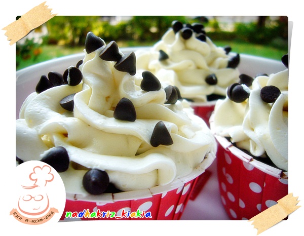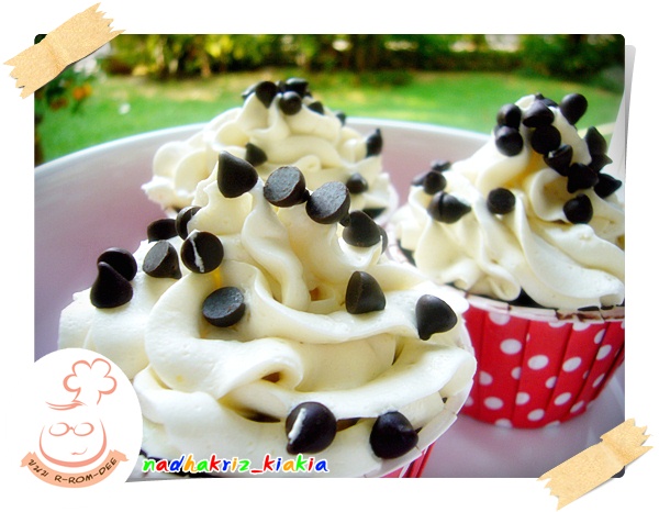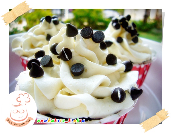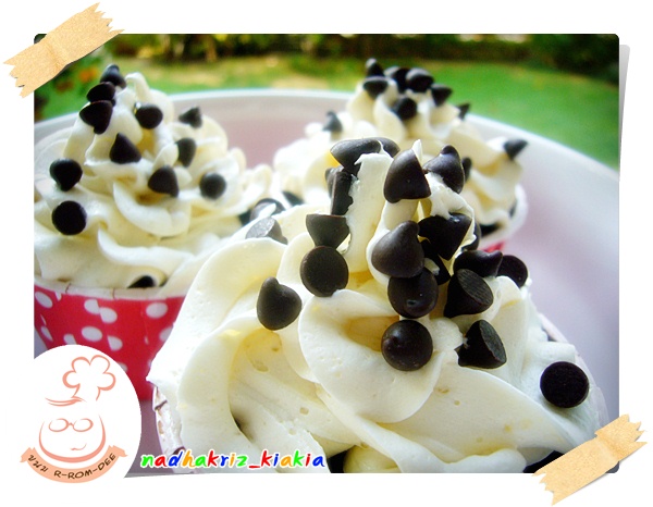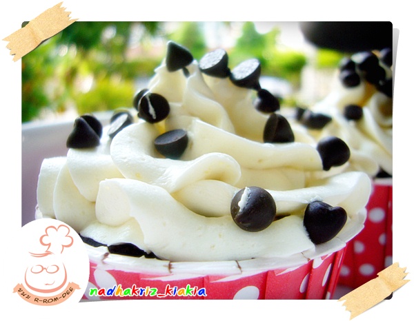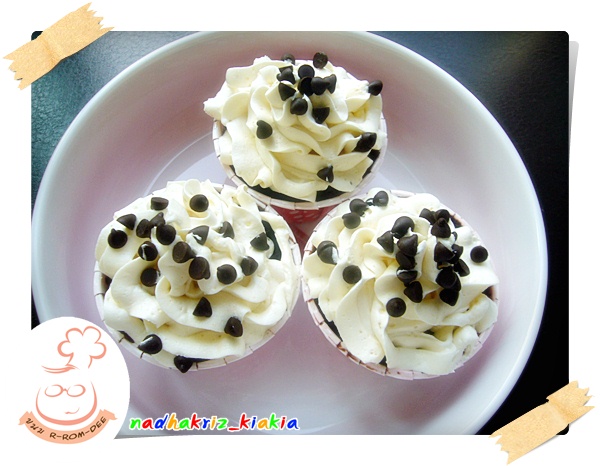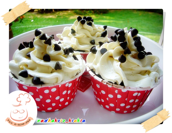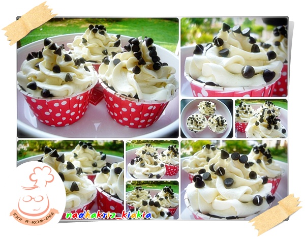 จากนั้นก็บีบครีมเลยครับ แล้วก็กลบเกลื่อนความไม่สวยด้วยช็อคโกแลตชิพโรยหน้า เพื่อให้งามขึ้นครับ 5555 เด๋วพอหมดเซ็ตคัพเค้ก ก็จะมีแบบจัดใส่จานให้ดูด้วยนะครับ มันคือส่วนที่โดนสไลด์ไปตอนต้นครับ ของอร่อยเสียดาย เราไม่ทิ้ง เอามาทานใหม่ 55555