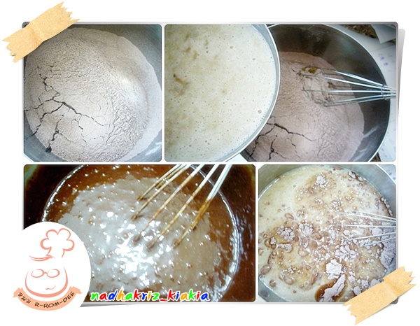 จากนั้นเอาของแห้งทั้งหมด ร่อนรวมกันซัก 2-3 รอบ จริงๆแล้ว 2 รอบก็พอ แต่ผมโรคจิตผมร่อนไป 3 รอบ 5555 จากนั้นก็เอาส่วนผสมของเปียกเทพรวดลงไปเลย แล้วก็ใช้ตะกร้อมือนี่แหละ คนให้เข้ากัน พอเห็นส่วนผสมเข้ากันเรียบร้อยแล้ว ก็เป็นอันเสร็จเรียบร้อย นั่งซดส่วนผสมได้เลย 55555 ไม่ช่ายยยยย เตรียมเอาลงพิมพ์เพื่ออบต่างหาก 55555