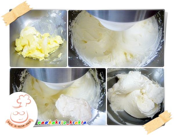 จากนั้นเราก็ไปตีเนยสดกับน้ำตาลทรายป่นครับ ตีจนขึ้นฟูขาวประมาณ 7-8 นาที จากนั้นก็นำเอาส่วนผสมนมที่ข้นหนืดค่อยๆใส่ลงไปทีละนิด แล้วตีจนเนียนให้เข้ากัน ข้อดูของฟรอสติ้งนี้ที่น้องบัวบอก คือมันจะไม่ละลายง่าย เพราะมีส่วนผสมของแป้งช่วยอยู่ อร่อยดีครับสูตรนี้ ลองดูนะครับ