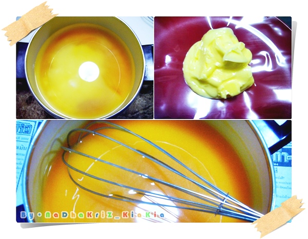 จากนั้นก็ใส่กลิ่นส้ม กับน้ำส้มซันควิกลงไป แล้วก็ตีพอเข้ากัน จากนี้ไปละครับ ที่ส่วนใหญ่จะมีปัญหาเรื่องเนย ละลายเนยครับให้อุ่นๆ อย่าร้อน หรือเย็นไป เคยอ่านในก้นครัวนี่แหละ เขาว่าไว้ว่าเย็นเป็นไต ร้อนเป็นยุบ