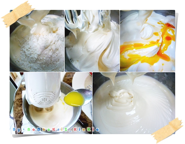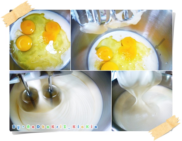 เริ่มแรกนะครับผมเอาไข่ไก่ น้ำตาลทรายป่น เกลือ น้ำเปล่า และนม ใส่ลงไปพร้อมกันทีเดียวเลยครับ จากนั้นเอาเอสพีป้ายหัวตะกร้อครับ แล้วก็ตีสูงเลยครับท่าน ตีไปเลยประมาณ 5 นาที สังเกตดูด้วยนะครับว่าสวนผสมต้องข้นฟูเลยล่ะครับ