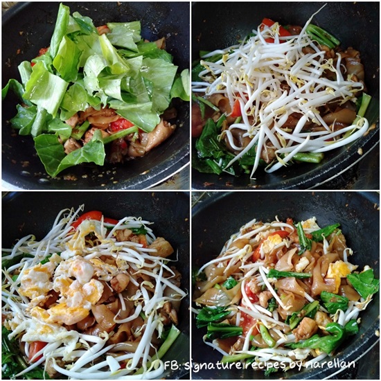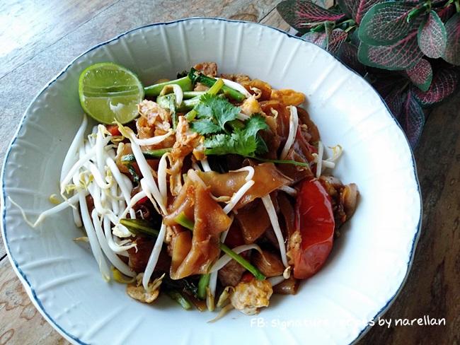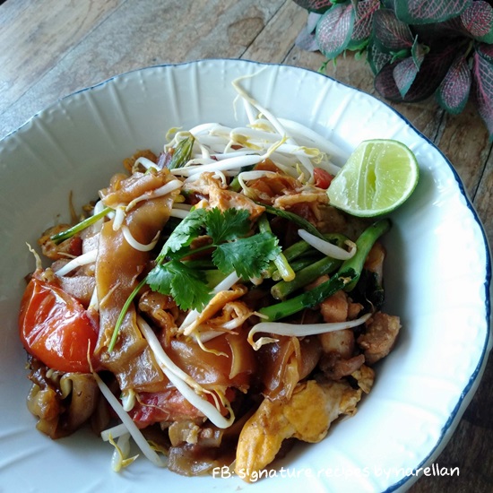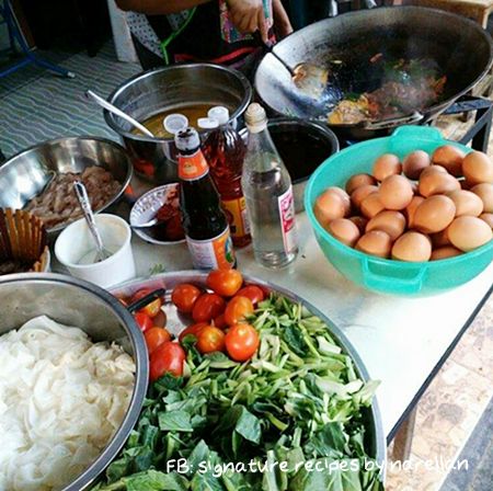 ปกติไม่กินหมูอยู่แล้ว หมูขึ้นราคาก็เลยไม่มีผลกระทบ(นอกเสียจากเนื้อสัตว์อื่นจะขึ้นราคาตาม)แต่ก็นะ อาหารบางอย่างต้องเป็นหมูถึงจะใช่ อาหารหลายอย่างใส่เนื้อสัตว์อื่นก็ไม่ฟินเท่าหมู ที่บอกมาข้างบนไม่เคยกินหรอก เขาเล่าว่าน่ะ ส่วนอาหารพื้นๆ หลายอย่างคนก็จะนิยมใส่เนื้อหมูมากกว่าเนื้อสัตว์อื่นเช่น ผัดซีอิ๊ว ราดหน้า .....วันนี้เลยเป็นที่มาของผัดซีอิ๊วไม่ใส่หมูแต่ใส่ไก่แทน ***************************************ผัดซีอิ๊วสูตรนี้จะต่างกว่าผัดซีอิ๊วทั่วไป ที่จริงสูตรคล้ายกันเคยลงบล็อกไปแล้ว"ผัดซีอิ๊วอินโด" ผัดซีอิ๊วที่ปรุง 4 รส เปรี้ยว หวาน เค็ม เผ็ดมาเรียบร้อย ตั้งแต่เราเด็กแม่จะทำแบบที่ว่าให้กินมาตลอด เคยได้ยินแม่บอกเหมือนกันว่าเดิมจะใส่กะทิด้วย แต่คงเป็นเมื่อก่อนไม่สะดวกหากะทิเหมือนเดี๋ยวนี้ที่มีแบบสำเร็จแม่ก็เลยไม่ได้ใส่จนเมื่อไม่นานมานี้ได้ไปซื้อก๋วยเตี๋ยวที่ชุมชนไปยืนดูพี่คนขายผัดพี่เขาผัดใส่กะทิแบบดั้งเดิมด้วย ก็เลยเอาสูตรที่ใส่กะทิมาลงเก็บไว้อีกครั้ง....พอใส่กะทิทำให้ก๋วยเตี๋ยวผัดของเรานัวและกลมกล่อมยิ่งขึ้นปล.อ่านแล้วจะเหมือนวิธีทำแยะ อย่าถอดใจค่ะ จริงๆ ก็เหมือนผัดซีอิ๊วธรรมดา * เพิ่มเติมเครื่องจากผัดซีอิ๊วทั่วไปแค่ 2 อย่างคือมะเขือเทศและถั่วงอก* แทนที่การเริ่มผัดจากพริกกระเทียมตำเป็นเครื่องผัดที่มี พริก หอม กระเทียม กะปิที่เราตำเตรียมไว้* ปรุงรสก็ใช้ซอสผัดที่เราปรุงสำเร็จเอาไว้ วัตถุดิบ* ก๋วยเตี๋ยวเส้นใหญ่ คลี่เส้นให้เรียบร้อยแล้วคลุกด้วยซีอิ๊วหวาน สีเข้มอ่อนตามต้องการ* เนื้อสัตว์ที่ต้องการ - ส่วนตัวชอบเป็นเนื้อติดมัน แต่ไม่มีติดตู้เย็นเลยใช้เนื้อไก่ส่วนสะโพก* ผักคะน้า จะเป็นคะน้าพันธุ์ไหนก็ได้ที่ชอบ* มะเขือเทศท้อ* ถั่วงอก* หัวกะทิคั้น หรือจะใช้กะทิขวดหรือกล่องก็สะดวกดี* ไข่ไก่ เราจะเจียวๆ ยีๆ พักไว้ก่อนแล้วค่อยใส่ทีหลังจะได้มีเนื้อไข่เป็นชิ้นๆ ไม่กลืนไปกับเส้นน้ำพริกสำหรับผัด* พริกชี้ฟ้าแห้งแช่น้ำให้นิ่ม หรือพริกสด ปริมาณตามชอบ* หอมแดง 2 หัว* กรเทียม 2-3 กลีบ* กะปิ 2/3 ช้อนชา......ตำทุกอย่างให้เข้ากันซอสสำหรับปรุงรสปรุงรสประมาณซอสผัดไทย เปรี้ยว หวาน เค็ม ชิมรสตามชอบ* น้ำมะขามเปียก * น้ำตาลมะพร้าวหรือน้ำตาลเปี๊ยบ * น้ำปลา(รูปจากร้านก๋วยเตี๋ยวที่เราไปซื้อ) วิธีทำ* ผัดน้ำพริกที่ตำไว้กับน้ำมันเล็กน้อยพอหอม* ใส่กะทิประมาณ 1ใ2 ทัพพี ผัดกับเครื่องให้หอมและกะทิแตกมันนิดหน่อย * ใส่ไก่ลงผัด ใส่ซอสปรุงรสกะปริมาณตามชอบ ปรุงรสให้เข้มหน่อยเพราะต้องเอาเส้นลงผัด* ตอนนี้ พริกตำ กะทิ ซอสปรุงพอผัดรวมกันกลิ่