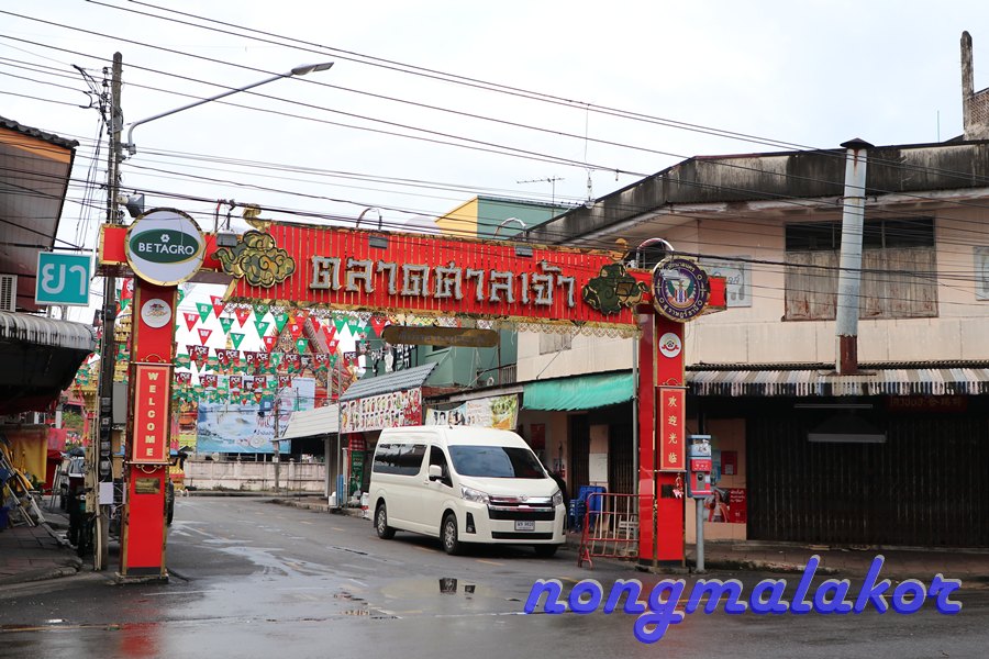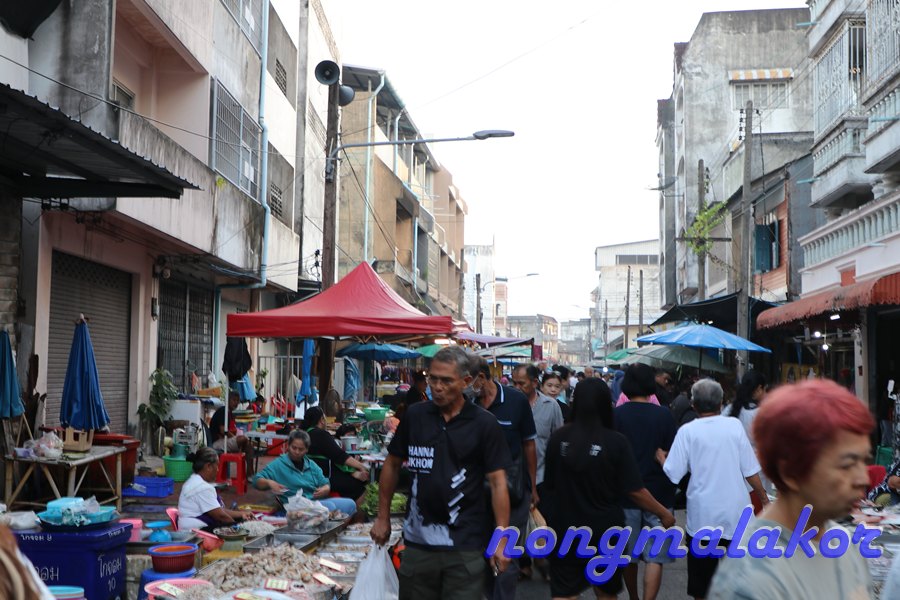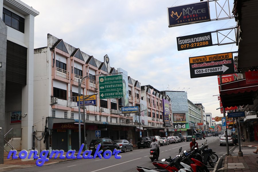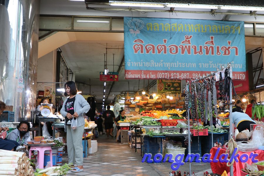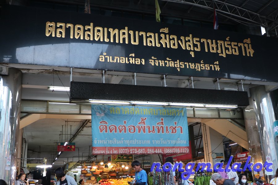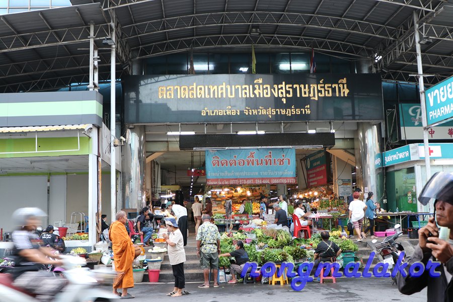 ถ้าข้ามถนน ทางตรงไปร้านทองเยอะเป็น ตลาดศาลเจ้า อยู่ซ้ายมือที่ตอนกลางคืนไปเดิน ถ้าแยกข้ามถนนจะไปถึงแม่น้ำตาปี ไปตลาดสด ทางซ้ายมือ จะผ่านด้านทางเข้าที่จอดรถ ถ่ายทางเดินไปเรื่อย ธนาคารเยอะมาก ไม่ไกลก็มาถึงตลาดสด ถึงตลาดสดเดินเข้าไปในตลาดสดลุยคนเดียว ของกินมีหลายอย่างมากผักสด ทั้งสะตอ ลูกเนียง พริกแกง วัตถุดิบ ปลา ของสดทะเล ขายกันเยอะ ไม่ปลุกให้เจี๊ยบนอนหลับยาวที่ห้องนอนคนเดียวไปก่อน