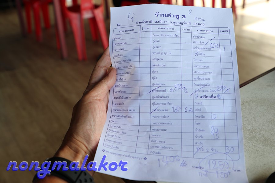 ตัวใหญ่สดพร้อมน้ำจิ้ม เคยกินร้านป้ายา หอยสด สุราษฎร์ธานี เคยนั่งกินในร้านอยู่ตัวเมือง น้ำจิ้มร้านลำภู ดีอร่อยกว่า แต่หอยนางรม ตัวใหญ่ราคาถูกกว่า กุ้งกะปิสะตอ จานกลาง 220 บาท กุ้งสดเด้ง ผัดสะตอ อร่อยมาก แซ่บมากยำไข่แมงดาทะเล เคยมากินครั้งแรก เจี๊ยบ ติดใจที่สุด เลยบอกมื้อเย็นอยากมากิน ร้านนี้ ราคา 450 บาท ตอนมากินครั้งแรกตกใจว่าทำไมถึงแพง แต่กินแล้วหายสงสัย อร่อยมากเครื่องยำสุดยอดปูม้าผัดผงกระหรี่ เจี๊ยบบอกปูสดมาก อร่อยสุด ใส่วุ้นเส้นด้วย ผัดปรุงรสชาติ กลมกลืน นัวปากมาก เจี๊ยบฟาดคนเดี๋ยวเกือบหมด เหลือให้กินครึ่งตัว บอกเสียดาย ตอนสั่งแค่ ครึ่งโล ได้มา 2 ตัว รู้งี้สั่งปูมา 1 โลได้ 4 ตัวกินกันฉ่ำปากแน่ ราคา 375 บาทนั่งกินกวาดเกลี้ยง ทุกเมนู อร่อยมาก ราคาทั้งหมด ตามเมนู 1,250 บาท อาหารที่สั่งมานั่งกิน 4 เมนู ทั้งน้ำแข็ง 1 ถัง น้ำเปล่า เป็บซี่ 1 ขวด ส่วน บวก 150 บาท คือกะปิ 1 ขวด กลับมาเจี๊ยบซื้อสะตอที่ตลาดสดสุราษฎร์มาผัดกินที่บ้าน บอกกะปิหอมดี รวมทั้งหมด 1,460 บาท ตามใบเสร็จช่วงกินใกล้อิ่ม เจี๊ยบเดินไปซื้อ ขนมจาก ร้านขายอยู่หน้าทางเข้าร้าน ลำภู 3 ซื้อมากินอีก จบทริปมื้อเย็น กินเสร็จ จ่ายตังค์ ออกจากร้าน มาถึงโรงแรม เวลา 16.30 น. ไมล์ 859.8 กม. ขึ้นห้องอาบน้ำ แล้วลงไปเดินไหว้ศาลหลักเมือง สุราษฎร์ธานี เดินผ่าน ร้านทำผม ป้าขอสระผมก่อนตามใจ ลุงก็เดินเล่นรอป้าสระผมเสร็จค่อยไปศาลหลักเมือง ร้านนี้ไงที่ ป้าเห็นขอทำผม เสร็จเดินเลาะริมแม่น้ำตาปี เดินถนนไปถึงศาลหลักเมืองมาถึงทำบุญ จุดธูป เทียน น้ำมัน และผ้าไปผูกบนศาลหลักเมือง เจี๊ยบให้พี่ผูกเสาเอง สวดตามมีแผ่นให้อ่านทำบุญเสร็จแล้วเดินเล่น กลับเข้านอน ข้ามถนนทางแยกเห็นสะพานพอดี เสร็จเดินกลับเส้นเดิม เลาะริมแม่น้ำตาปี ต่อ วันนี้เห็นขนมหวานร้านป้ายา เคยมากินแล้ว เลือกขนม จิ้มๆนั่งโต๊ะกินหมดจ่ายตังค์จบ มาครั้งนี้ มีเมนูให้จดรายการแล้วเอาใบจดไปยื่นที่โต๊ะจ่ายตังค์ เสร็จแล้ว เด็กร้านเอาใบสั่งอาหารจ่ายตังค์แล้วไปให้ร้านตักมาให้นั่งกินที่โต๊ะ ของลุง รวมมิตรใส่ทับทิมกรอบ ของเจี๊ยบสาคู มาใต้ทีไร สาคูอร่อยมาก กินขนมหวานเสร็จเดินกลับโรงแรม ทางหอนาฬิกา ที่ประดับไฟปีใหม่ เดินเข้าตลาดศาลเจ้า ผ่านขนมจีน เจี๊ยบชอกกิน อิ่มแล้วได้เดินมอง กินไม่ไหวแล้ว วันอังคารที่ 30 ธันวาคม 2568