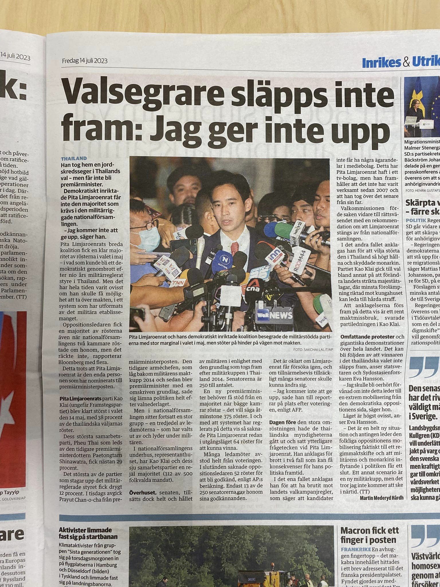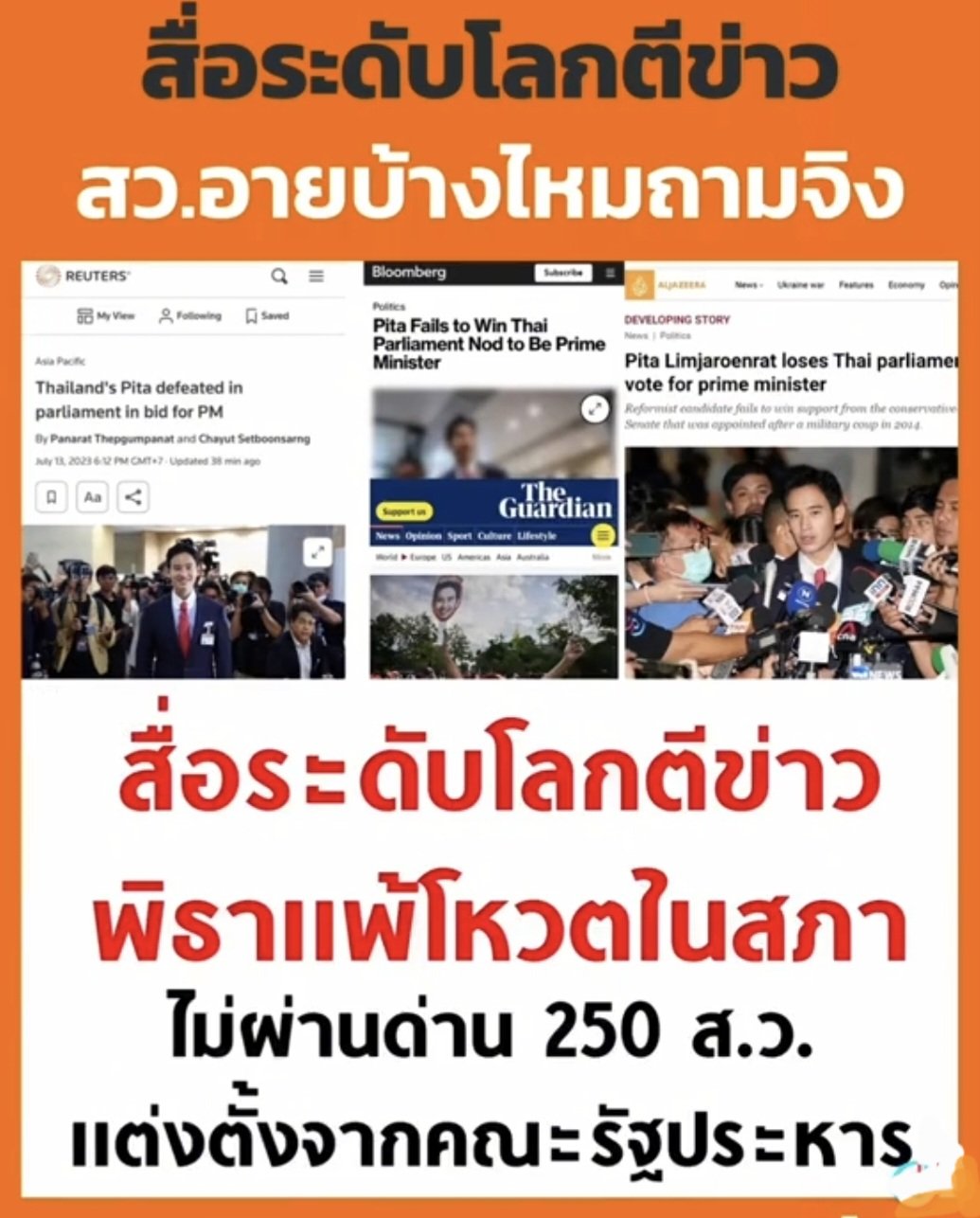 พาดหัวข่าว : ผู้ชนะการเลือกตั้งไม่ได้ไปต่อ "ฉันจะไม่ยอมแพ้" ลงมะติเสียงข้างมากไม่ให้ พิธา ลิ้มเจริญรัตน์ ได้ไปถึงเป้าหมาย โดยมีทหารเป็นหัวเรือใหญ่ ถึงแม้เขาจะใช้ได้รับชัยชนะ อย่างถล่มทลาย แต่ก็ไม่ได้เป็นว่าที่นายกรัฐมนตรี - แนวร่วมประชาธิปไตยของเขาได้รับการสนับสนุนและเอาชนะพรรคที่ถูกสนับสนุนโดยพรรคทหาร ด้วยคะแนนเสียงอย่างล้นหลามในการเลือกตั้งเมื่อเดือนพฤษภาคมที่ผ่านมา แต่ก็ได้พบกับอุปสรรคบนเส้นทางสู่อำนาจ แปลอย่างบ้านๆ โดยฉัตรนภา แวงคำ