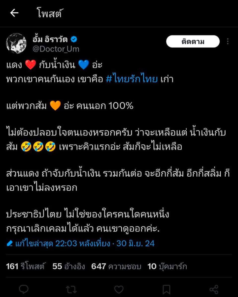 แล้วก็เตือนพรรคส้มไว้ ไม่ต้องถอยจากที่คุณตั้งข้อกำหนดไว้ คุณกำหนดไว้ 3 ข้อ พรรคไหน กลุ่มในยอมรับได้ก็แค่ยกมือให้ ชัดเจนไม่ต้องสนใจ แค่นั้นพอ "จบ" ไม่ต้องกังวลอะไรเลย มันง่ายๆ แค่นี้เอง
