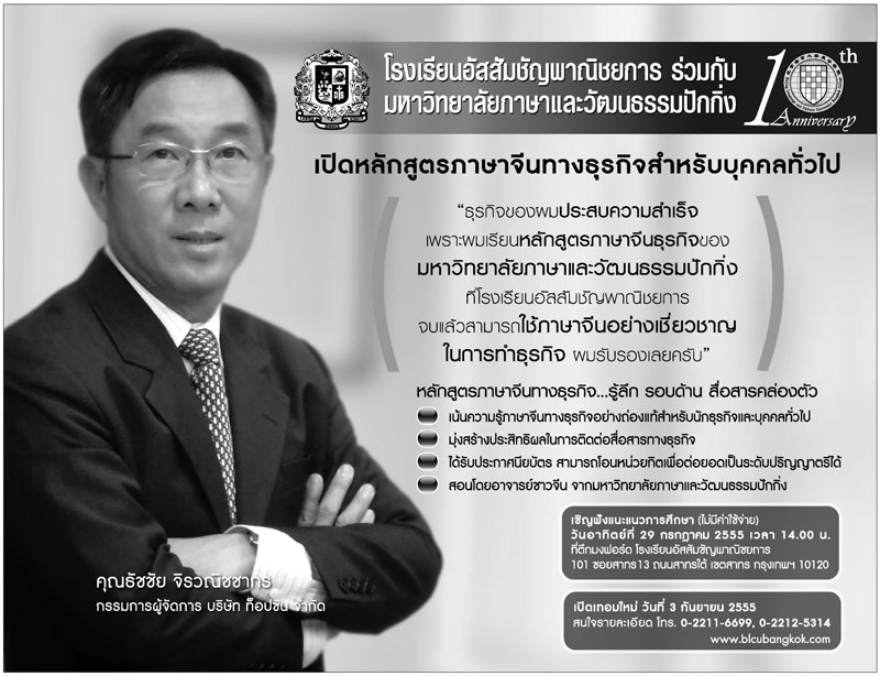 เชิญฟังแนะแนวการศึกษา วันอาทิตย์ที่ 29 กรกฎาคม 2555 เวลา 14.00 น ที่ตึกมงฟอร์ด โรงเรียนอัสสัมชัญพาณิชยการ (ไม่มีค่าใช้จ่าย) 101 ซอย สาทร13 ถนนสาทรใต้ เขตสาทร กรุงเทพ 10120 เปิดเทอมใหม่ วันที่ 3 กันยายน 2555 สนใจรายละเอียดโทร 0-2211-6699 0-2212-5314 www.blcubangkok.com