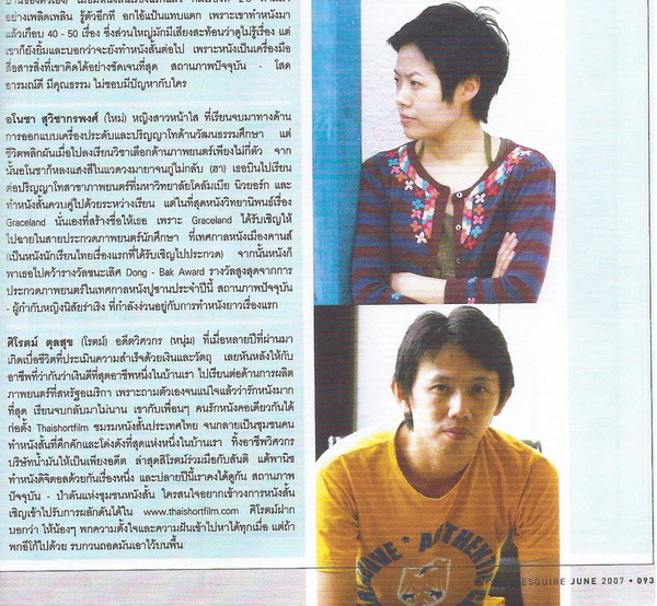 นิตยสาร ESQUIRE ฉบับมิถุนายน 2007 วางแผนแล้ว ปกฮัลลี่เบอร์รี่ มีการสัมภาษณ์คนทำหนังไทย อาทิ ยุทธนา มุกดาสนิท,อภิชาติพงศ์ วีระเศรษฐกุล,อโนชา สุวิชากรพงศ์,เว๊ปมาสเตอร์ ไทยซอร์ตฟิล์ม ศิโรตม์ ตุลสุขและเรื่องราวการเซ็นเซอร์ภาพยนตร์ "แสงศตวรรษ" ขอเชิญไปลองหาอ่านกันได้นะครับ