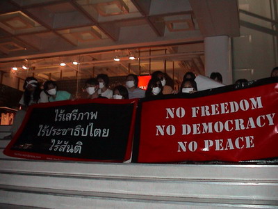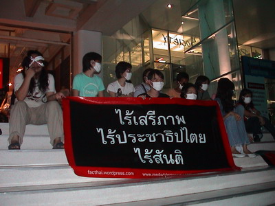 ผมมีโอกาสได้ไปร่วมประท้วงในการประท้วงเล็กๆ เพื่อสิทธิและเสรีภาพในการนำเสนอสื่อ นำโดยคนกลุ่มเล็กๆ ที่เห็นว่าเขาโดนลิดรอนสิทธิ ผมไปในฐานะสื่อทำข่าว(ไทยซีเนม่า+ไทยชอร์ตฟิล์ม) และในฐานะคนร่วมประท้วงด้วย ตอนแรกผมออกจะตื่นเต้นไม่น้อยว่า เอ๋ มันจะเป็นอย่างไรนะ เพราะตั้งแต่เกิดมาผมไม่เคยไปประท้วงอะไรกับใครเลย ได้แต่นั่งดูทีวีมองเขาประท้วงกันอยู่ที่บ้าน แต่การประท้วงครั้งนี้ก็ไม่ได้เป็นในแบบที่ผมคาดหวังไว้สักเท่าไหร่นัก เพราะเป็นการประท้วงเล็กๆ เงียบๆ เชียบๆ โดยจะทำการประท้วงหนึ่งชั่วโมง คนสิบกว่าคนนั่งปิดปากกันที่หน้าสยามเซ็นเตอร์ วันที่ประท้วงเป็นวันที่ 16 ตำรวจคงจะไปสนใจคนที่ประท้วงอยู่ที่มุมอื่นๆ ของเมืองมากกว่า คนที่ผ่านไปผ่านมาก็หันไปมองด้วยความแปลกใจบ้าง ผมไม่แน่ใจว่าเขาจะรู้หรือเปล่าว่าพวกเรากำลังทำอะไรกันอยู่ แต่ผมว่า พูดเสียงเบาๆ ดีกว่าไม่ได้พูดอะไรเลยนะครับ