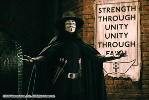 ฮิวโก้ วีฟวิ่ง ในบท "V" ...จาก "V for Vendetta" แม้เราจะไม่ได้เห็นใบหน้าที่แท้จริงของเขาเลยแม้สักเศษเสี้ยว แต่ความสามารถผ่านน้ำเสียงและลีลาการแสดงออกที่แพรวพราวของเขาก็สำแดงพลังออกมาให้เห็นได้ถึงความทรงพลัง แกร่งกล้าของ นักสู้อุดมการณ์สูงส่งนามกรตัวอักษรผู้นี้