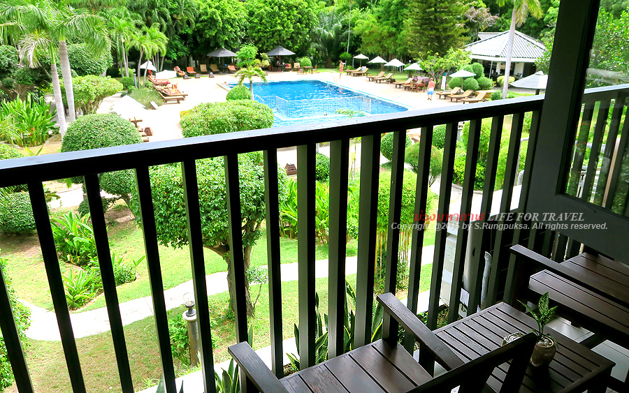 จากระเบียงหลังห้อง ยังนั่งเพลินๆ ชมวิวสระว่ายน้ำได้อีกด้วยครับ