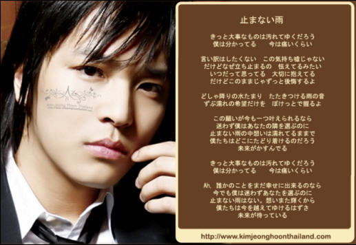 ผมได้ลองหาข้อมูลดู ก็เป็นเพลงญี่ปุ่นที่ดาราเกาหลีร้องไว้ ดาราเกาหลีคนนั้นคือ Kim Jeong Hoon / คิม จอง ฮุุน เรื่องดาราเกาหลี ผมไม่สันทัดสักเท่าไหร่ ลองเช็คข้อมูลในเนต ก็มีหลายเวปที่พูดถึง รู้สึกจะมีเวปเเฟนคลับในไทยด้วย เเต่ต้องสมัครสมาชิกก่อน ถึงเข้าไปดูรายละเอียดได้ *เวปตามที่ระบุในรูปข้างบนเลยครับ ขอสูบลงในบล็อคนะ ผมไปเปิดเจอในกูเิกิ้้ล ขอบคุณเจ้าของรูปด้วยนะครับ