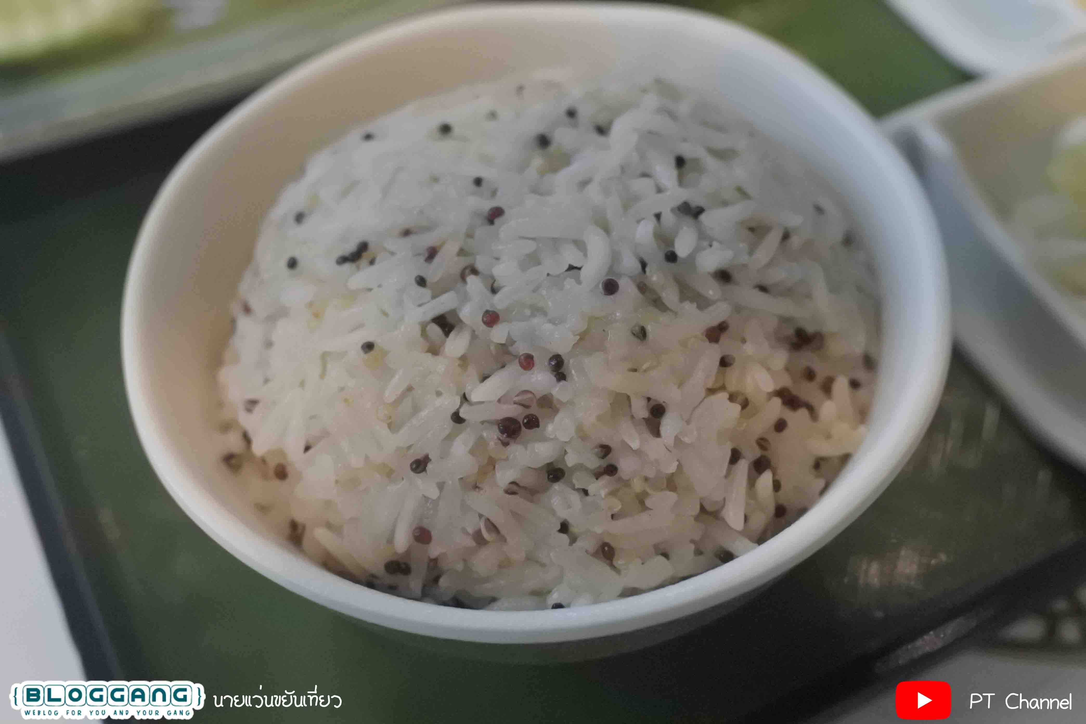 ในชุดกฅ็จะมีข้าวมันที่ใส่ควินัว เป็นเม็ดเล็กๆสีขาว และสีน้ำตาล