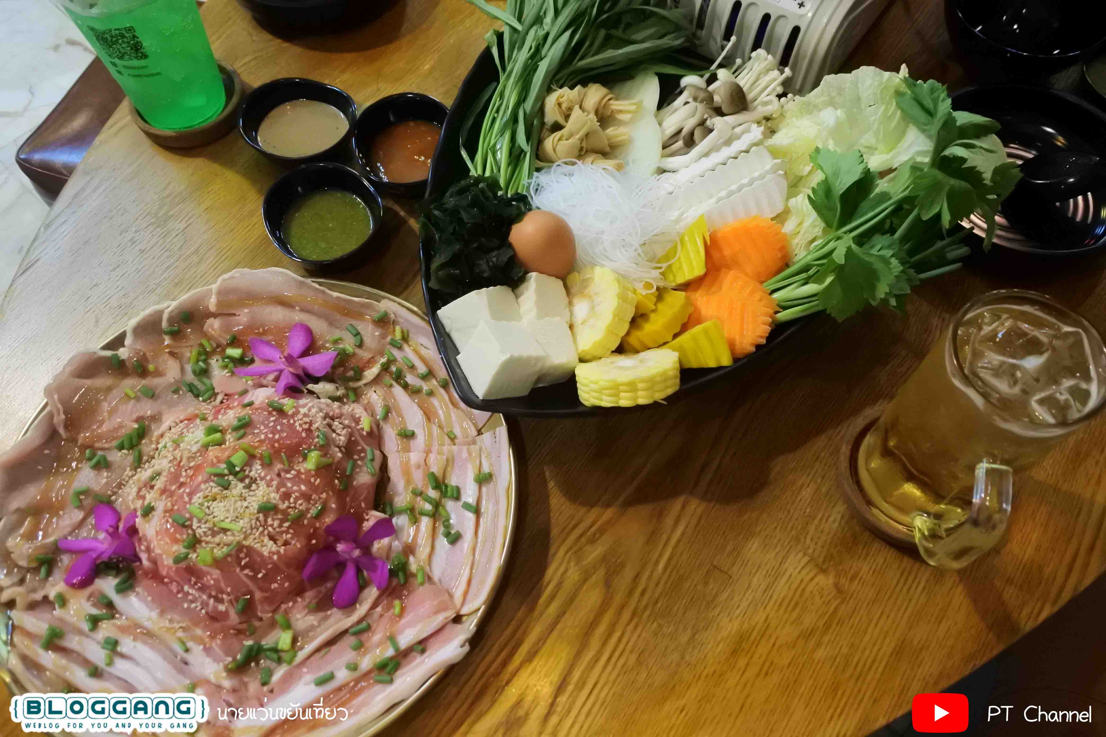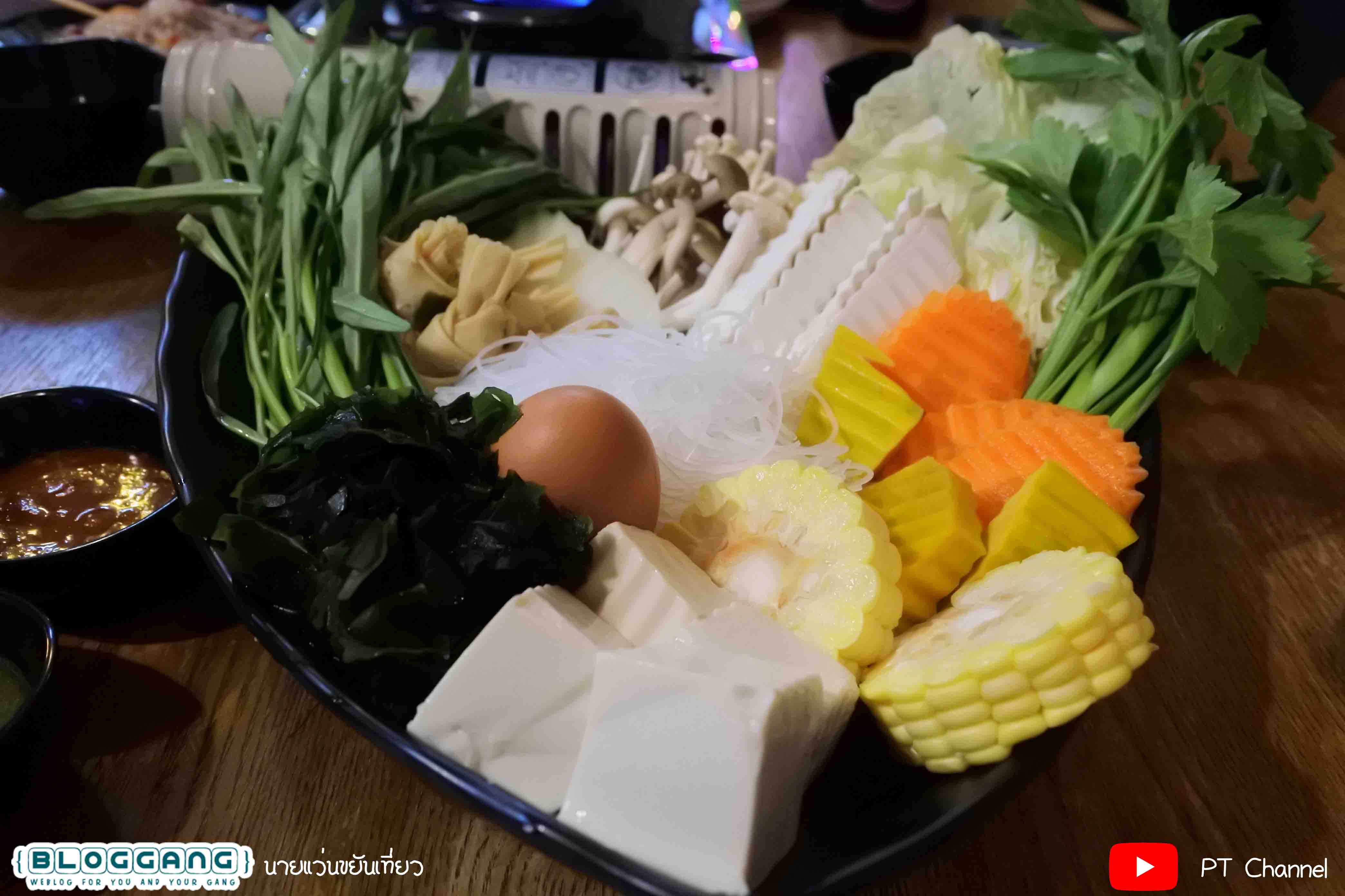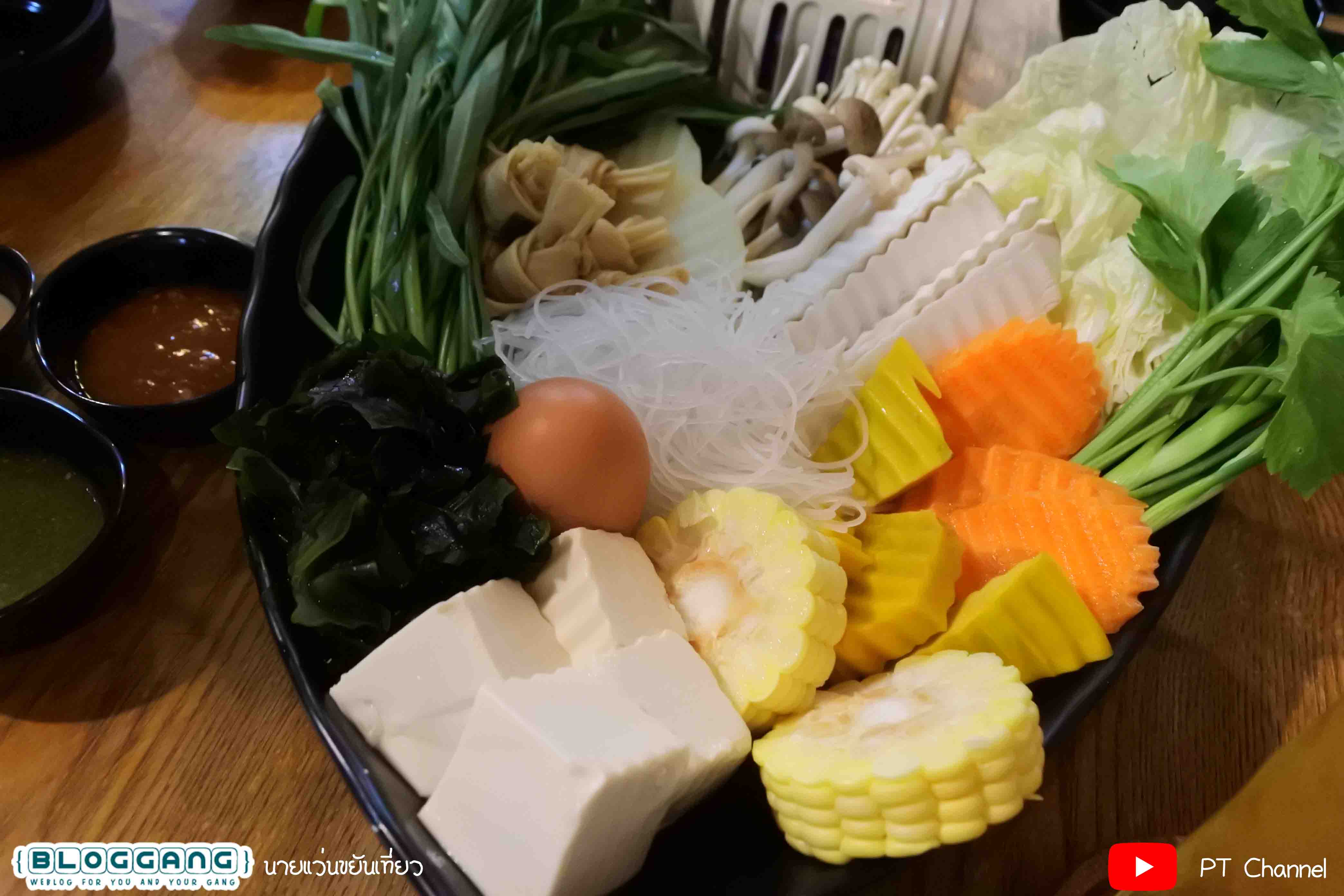 มาพร้อมผักให้ที่ถ้วย ประกอบด้วย ผักบุ้ง เห็ด3อย่าง วุ้นเส้น ไข่ไก่ เต้าหู้ ข้าวโพด
