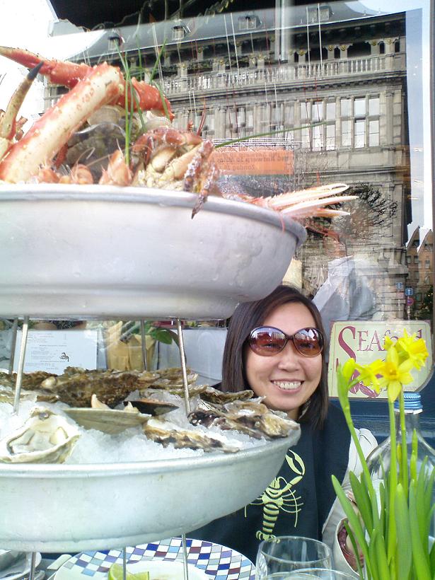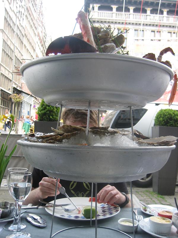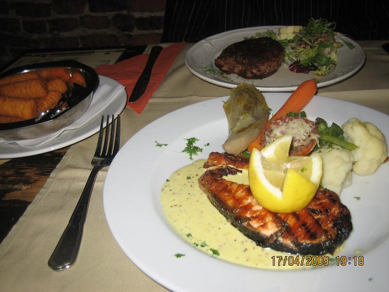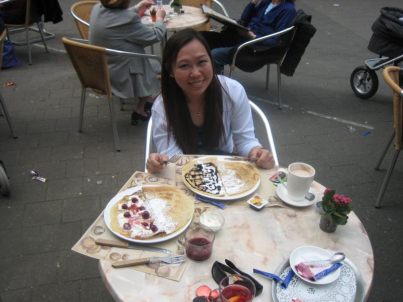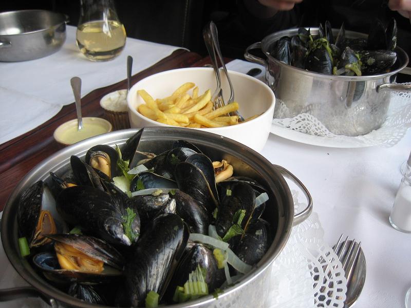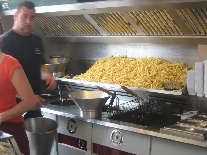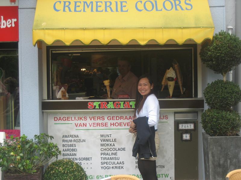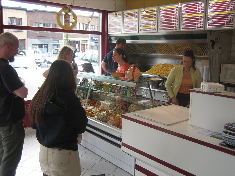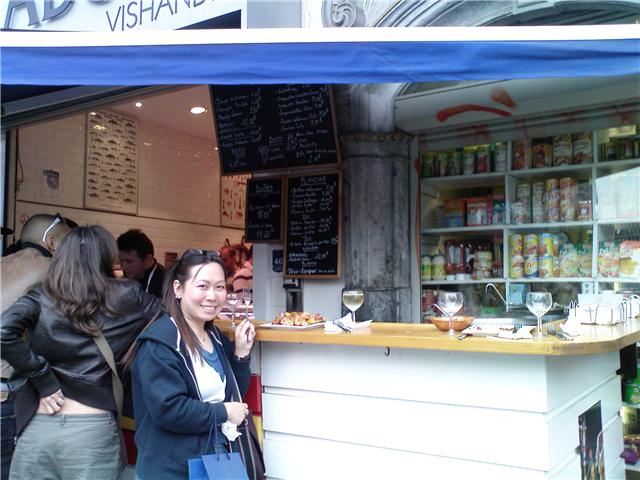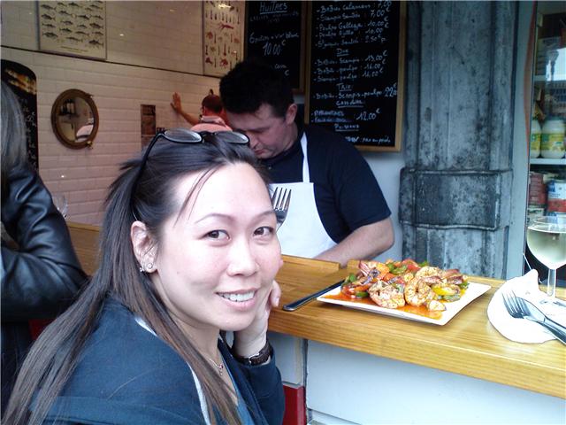 ถ้าพูดถึงอาหารประจำชาติของเบลเยี่ยมก็คงเป็น French fried ซึ่งมีการสันนิษฐานว่ามีต้นกำเนิดจากประเทศนี้ คนที่นี้จะเรียกว่า Frit เค้าทานกันเป็นอาหารหลักเลยก็ว่าได้ ไม่ว่าจะทานอะไรก็จะมีเจ้่า frit มาเป็นเครื่องเคียงแทบทุกเมนู บางทีก็ทานแทน dinner ไปเลย แล้วเปิ้ลก็ชอบมากกกกกกกกก เดิมก็เป็นคนชอบทานพวกนมๆเนยๆขนมปังอยู่แล้ว แล้ว frit ที่นี่แบบว่าอร่อยมากมาย frituur ร้อนๆราดด้วยมายองเนส โหยยยยย สุดยอดจริงๆ พูดแล้วน้ำยายยยไหลเลย 55 ร้านขาย Frit คะปกติแทบทุกร้านก็จะมีขายพวกนี้พร้อมกับเฟรนฟรายน่ะคะ พวกที่อยู่ในตู้ เค้าเรียกว่า ".." (ติดไว้ก่อนนะคะเพราะลืม ) ก็ประเภทคล้ายไส้กรอกหรือปลาอัดแท่งแล้วเอามาทอดน่ะคะ มีให้เลือกเยอะแยะมากมายเลย แต่ทานมากๆก็เลี่ยนอะSalmon steak ของเรา อร่อยมากมาย และมีเฟรนฟรายมาให้ด้วย แต่อันนี้แบบเป็นแท่งกลมๆ อร่อยมากเหมือนกันเพราะเวลาทานแล้วมันรู้สึกถึงมันฝรั่งเต็มๆน่ะคะ อร่อยๆอาหารอีกอย่างคือวาฟเฟิลคะ เป็นอาหารขึ้นชื่ออีกอย่างของเบลเยี่ยม (อาหารนะคะไม่ใช่ขนม ) เรื่องความสดอร่อยก็ไม่ต้องพูดถึง แทบทุกร้านทั้งร้านเล็กร้านใหญ่ อร่อยทั้งนั้น แล้วก็มีขายอยู่ทั่วไปคะ ก็เหมือนร้านลูกชิ้นปิ้งบ้านเราแหล่ะคะ นี่ขนาดเพื่อนเปิ้ลที่อยู่ลอนดอน เคยมาเที่ยว Brussels ก็ยังติดใจวาฟเฟิลที่นี่มากๆ ของที่อังกฤษน่ะคนละเรื่องเลย พอดีไม่ได้ถ่ายรูปวาฟเฟิลร้อนๆมาไว้เลย หม่ำหมดซะก่อน มีแต่วาฟเฟิลที่ซื้อจากตลาดแถวบ้านคุณแฟน (ที่นั่นก็มีตลาดนัดเหมือนกันนะ อิอิ แต่เค้าเน้นเป็นขายพวกของกินน่ะคะ) ก็อร่อยมากๆเหมือนกัน เพราะร้านนี้เค้าอบกันสดๆ ขาย bakery น่ากินทั้งนั้นเลย วาฟเฟิลของเค้าหอมเนยๆนมๆมากเลย มีหลายรส มีรสช็อคโกแลตด้วย เลยซื้อมาฝากที่บ้านด้วย อร่อยๆ แต่แอบแพงน่ะเนี่ย แพ็คนึง 5 ยูโรมี 6 ชิ้น ชิ้นกระจิ๋วนึง แต่อร่อยสมราคาคะพูดถึงวาฟเฟิลแล้วก็ต้องตามด้วยแพนเค้กคะ อร่อย(มาก)เช่นกัน แล้วเห็นอากาศหนาวๆอย่างนี้ คนที่นั่นก็โปรดปรานไอศครีมกันมากเหมือนกันนะคะ เห็นได้จากร้านไอศครีมตามสถานที่ท่องเที่ยวต่างๆ บางร้านคนมุงกันเต็มเลย (โดยเฉพาะร้านจาก Australia เนี่ย แต่ชื่ออะไรจำไม่ได้แล้ว ละก็ลืมถ่ายรูปมา อิอิ) มีแต่รูปเรากับคนขายไอศครีม (ของที่เราสั่งอันเล็กนะคะ ไม่ใช่อันใหญ่นั่น )ก็อย่างที่ทราบกันนะคะว่าพวกฝรั่งเนี่ย อาหารของเค้าจะจานอย่างใหญ่โต อิอิ เปิ้ลน่ะแรกๆ ที่ไปทานหมดไม่ถึงครึ่งด้วยซ้ำ จริงๆสั่งแบ่งกัน 2 คนยังแบบว่าอิ่มมากได้เลย แต่วัฒนธรรมทางเค้าจะของใครของมัน จานใครจานมันแม้แต่พิซซ่า แต่หลังๆเราก็เริ่มชิน + ชอบอ