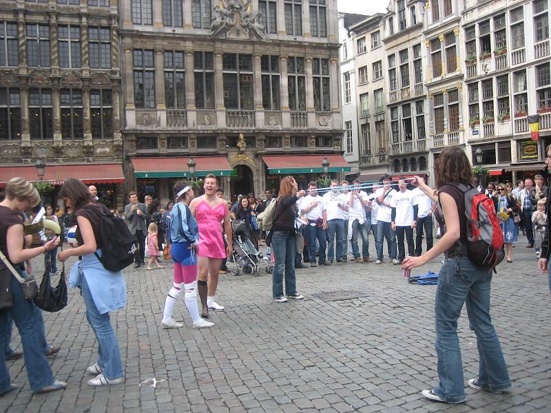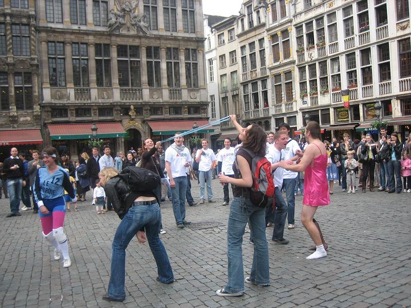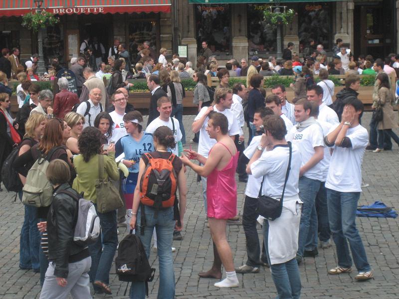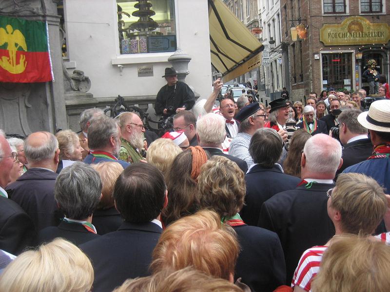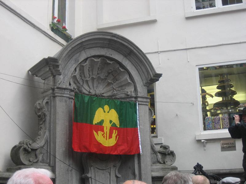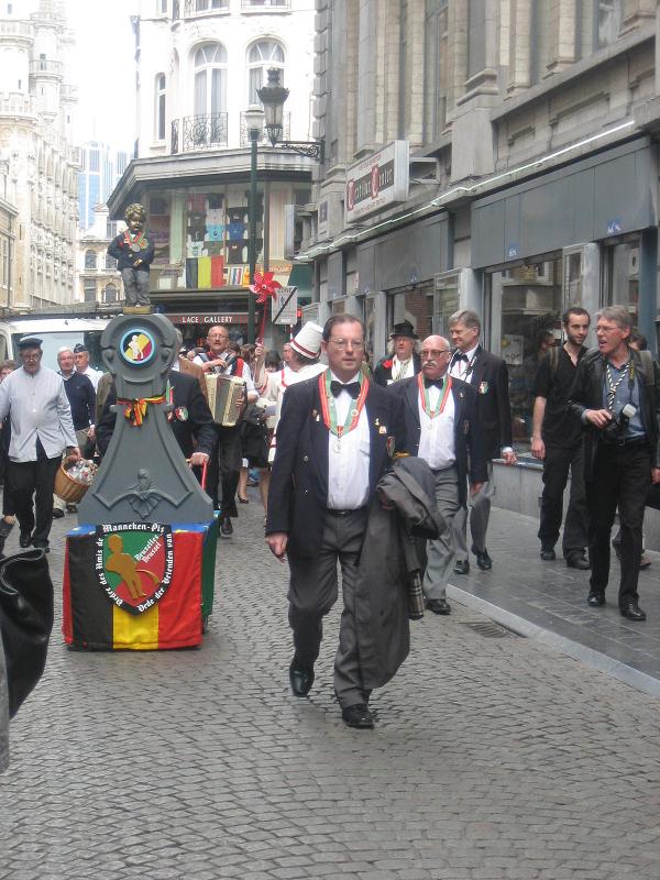 กำลังเดินเล่นอยู่เพลินๆ ก็มีเสียงเป่าแตรเป่าปี่ตีกลองมาใกล้ๆ หันหลังไปดูก็เจอขบวนแห่อะไรซะอย่างคะ มีเสียงคนกรี๊ดแล้วก็หัวเราะกันใหญ่เลย เราก็เลยหยุดดูกันคะ ก็เจอกลุ่มหนุ่มใหญ่ (ส่วนมากน่ะ อิอิ) เดินขบวนกันมา เห็นว่าเข็นอะไรมาด้วยสักอย่าง (เหมือนขบวนแห่นางนพมาศงัยงั้นเลยอะ ) แล้วก็เห็นว่าเป็นรูปปั้นจำลองเจ้า Manneken Pis หรือเจ้าเด็กยืน XX นั่นเอง