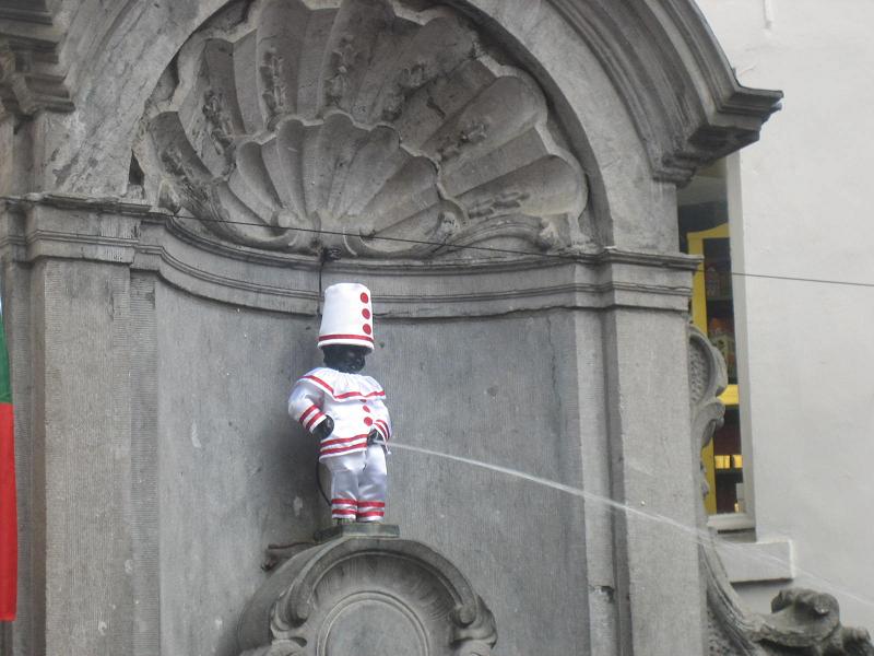 แล้วถึงมาทราบว่าเค้ากำลังจะเปลี่ยนชุดให้เจ้า Manneken Pis จ๊ะ จริงๆเลยนะ เพิ่งจะรู้วันนั้นเองว่าเจ้านี่น่ะมีตอนใส่เสื้อผ้าด้วย แล้วใส่มาเป็นร้อยๆชุดได้แล้ว ชุดที่ได้ก็มาจากหลายประเทศทั่วทุกมุมของโลกเลยเค้าส่งมาเรียกว่า donation รวมถึงเคยใส่ชุดประจำชาติไทยเรามาแล้วด้วย ว้าว ความรู้ใหม่น่ะเนี่ย หุหุ หรือว่ารู้ช้าไปมากกันแน่  เพราะปีที่แล้่วที่ไปก็เห็นว่ายืนแก้ผ้าอยู่นี่นา ภาพจากปีที่แล้วจ้า