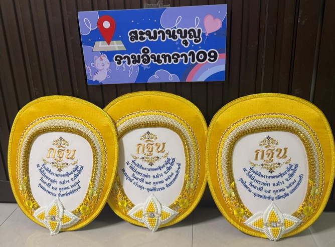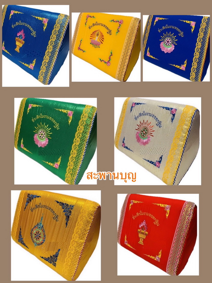 ที่ตกแต่งด้วยดอกไม้พลาสติก ดอกรัก ดอกพุด ลูกปัดสีสัน ลูกปัดทอง หรือดอกมะลิ บัวศิลปชีพ ผ้าเพชร เพื่อใช้ในงานบวชและงานทอดกฐิน
