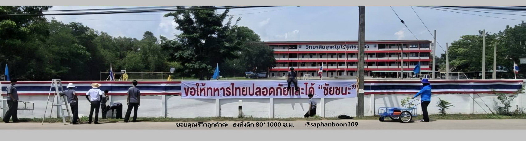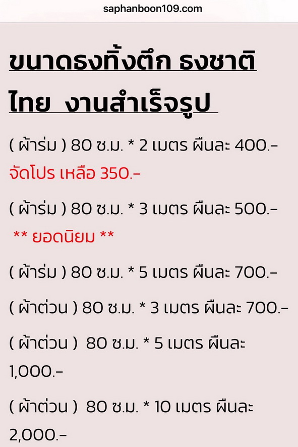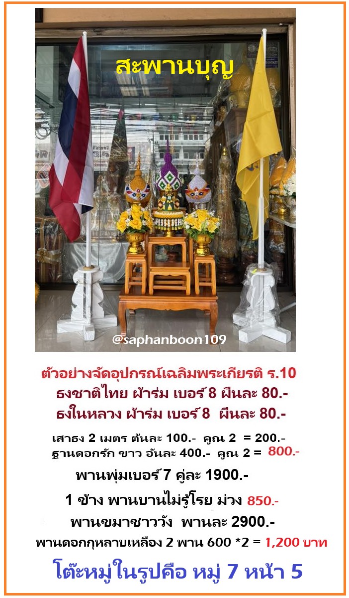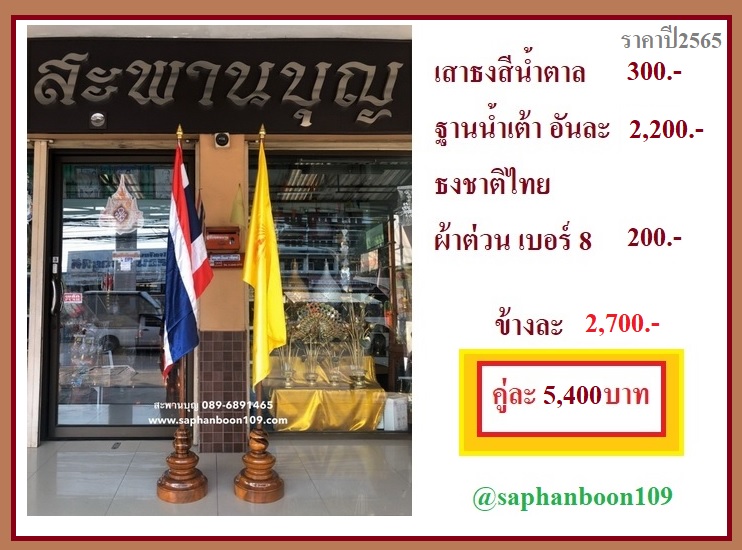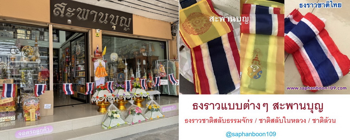 ร้านสะพานบุญ ริมถนนรามอินทรา ขายธงต่างๆ มีผ้าร่มและผ้าต่วน ธงชาติไทย ธงในหลวง ธงพระราชินี ธงพระพันปีหลวง ธงพระเทพ ธงทิ้งตึก ธงต่างๆ ธงอาเซี่ยน ธงหมากรุก ธงเซฟตี้ ปลอดภัยไว้ก่อน เสาธง ฐานน้ำเต้า เสาน้ำตาล ขาเสียบธง ธงราวงานวัด ธงสามเหลี่ยม 7 สี ธงฉัพพรรณรังสี ธงธรรมจักร ธงราวชาติไทย ธงโบกชาติไทย ธงโบกพระเทพ พานพุ่มเงินพานพุ่มทอง พานพุ่มในหลวง กรวยพานขมาเฉลิมพระเกียรติแบบออกถ่ายรายการทีวีแบบใหญ่ๆสวยๆ ราคาสินค้าทั้งร้านทุกชิ้นเปิดเผย โปร่งใสชัดเจนแบบ100% ราคาสินค้า ทั้งร้านทุกชิ้น ดูหน้าเว็บได้หมดเลยค่ะ ช่องบนสุดของเว็บ มีช่องให้ค้นหา ราคา ดูราคากันได้เลยค่ะ ราคาหน้าเว็บ = ราคาหน้าร้าน *** ไม่รวมจัดส่ง *** ( แกรป / EMS ) สั่งซื้อที่ไลน์เท่านั้น ( ไลน์ : @saphanboon109 )