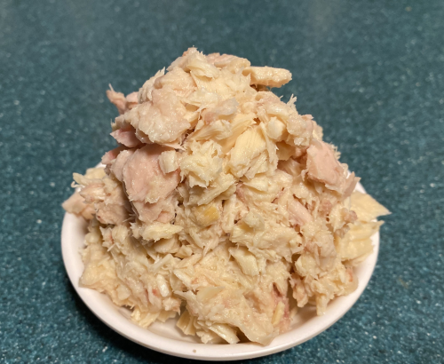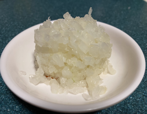 2) หั่นหัวหอมเป็นลูกเต๋าชิ้นเล็กๆ เท่าที่จะเล็กได้ 1ถ้วยตวง  3) ทูน่า 1 กระป๋อง (250 กรัม) ใช้ส้อมตัดๆแคะๆ ให้ชิ้นพอๆกับหอมแดง อย่าให้เป็นก้อนใหญ่ค่ะ