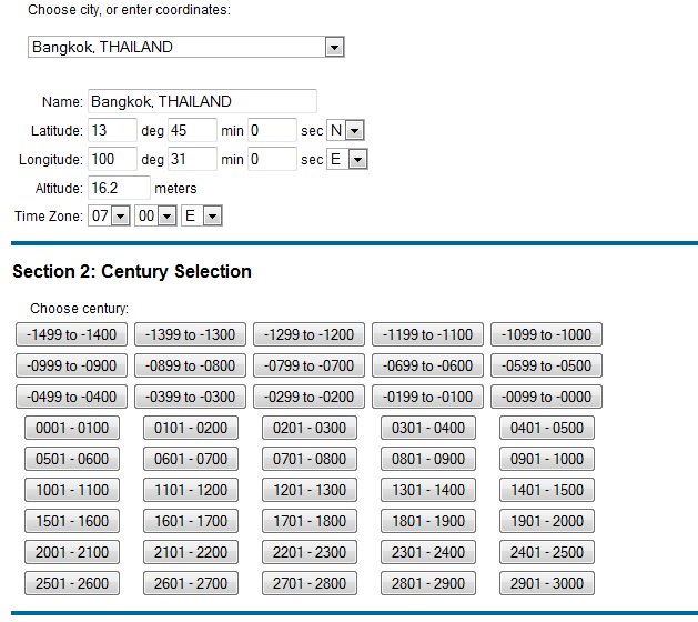 แล้วก็จะปรากฎพิกัดของกรุงเทพฯ ในช่อง Latitude, Longitude และก็ในส่วนของ Time Zone ให้ปรับเป็น 7 ชั่วโมงก่อนกรีนิชครับ จากนั้นใน Section 2 ก็เลือกปี ค.ศ. ที่อยากชมได้เลยครับ ไม่ว่าอดีตหรืออนาคต