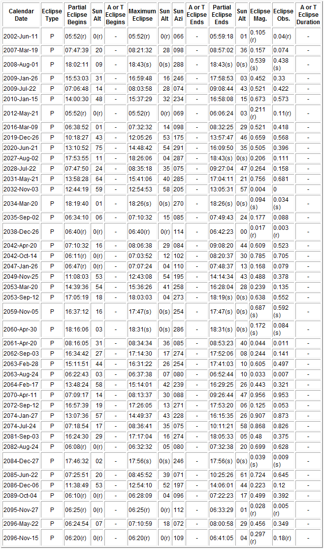 ในช่อง Eclipse Type ที่ขึ้นตัว P นั้น หมายถึงเป็นสุริยุปราคาชนิดบางส่วนหมดเลยครับ - -! หากเป็นตัว T หมายถึงเต็มดวง และหากเป็นตัว A หมายถึงวงแหวน ส่วนช่องรองสุดท้าย Eclipse Obs. คงหมายถึงระดับการกินลึก จะมากสุดไม่เกิน 1 (คูณ 100 คงได้เปอร์เซ็นต์) ดังนั้น หากเป็นชนิดเต็มดวง(T) จะเป็น 1 เสมอ ส่วนวงแหวน(A) ก็จะไม่ถึง 1 เพราะยังเห็นขอบดวงอาทิตย์เป็นวง ไม่ต่างจากชนิดบางส่วนครับ