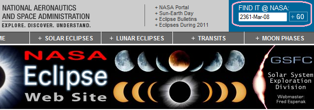 ถ้าอยากรู้เส้นทางของสุริยุปราคานั้นหละ? เมื่อพบวันที่เกิดสุริยุปราคาต้องสงสัยแล้ว ก็ลองก็อปวันที่ในช่อง Calendar Date ไปใส่ในช่อง FIND IT @ NASA: ที่มุมบนด้านขวาของเว็ป เช่น สุริยุปราคาเต็มดวงพาดผ่านกรุงเทพฯในอนาคต ก็ปาไป 2361-Mar-08