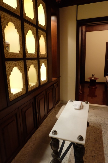 ด้านหน้าของบริเวณที่เป็นส่วนสปา (เนี่ยถ้าเป้แต่งชุดพื้นเมืองนะค่ะรับรองว่าตัวเองต้องมีความรู้สึกว่าเป็นเจ้านางที่มาเตรียมสรงน้ำจริง ๆ อิอิอิ) เมื่อมาถึงเจ้าหน้าที่จะให้เราทำแบบสอบถามซึ่งเป็นคำถามเกี่ยวกับร่างกาย การกินอาหาร การนอน การใช้ชีวิตวิถีและกิจวัตรในแต่ละวัน ซึ่งมีคำถามประมาณ 4-5 หน้ากว่าจะตอบคำถามเสร็จก็เล่นเอาเหนื่อยค่ะ มีความรู้สึกเหมือนทำข้อสอบหน่อย ๆพอกรอกข้อมูลเสร็จ จะมีคุณหมอซึ่งเป็นคนอินเดียและจบมาเกี่ยวกับด้านนี้โดยเฉพาะจะมาพูดคุยกับเราเป็นภาษาอังกฤษ(หากท่านใดไม่ถนัดภาษาอังกฤษ พนักงานของสปาก็จะมาแปลให้ฟังค่ะ)และคุณหมอก็จะแนะนำคอร์สการนวดหรือการปฏิบัติตัวต่าง ๆ ที่เหมาะกับเรา บริเวณล็อบบี้ของตึกที่เป็นสปา เป็นที่ที่เจ้าหน้าที่ คุณหมอและแขกที่ขอเข้ารับบริการจะมาพูดคุยกันเพื่อเลือกสปาที่ต้องการ