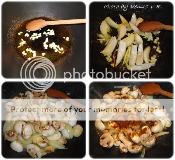 1. ตั้งกระทะใส่น้ำมันลงไป พอน้ำมันเริ่มร้อน ก็ให้ใส่กระเทียมสัมและหอมใหญ่หั่นซีกตาม (บ้านนี้ชอบผัดรวมแบบนี้คะถ้ามีกระเทียมสับและหอมใหญ่ในสูตร ใครจะผัดกระเทียมสับก่อนก็แล้วแต่นะคะ ตามชอบคะ) ผัดจนเป็นสีเหลืองทองและเริ่มสุก ก็ให้ใส่เห็ดแชมปิยองลงไป คลุกเคล้าให้เข้ากัน