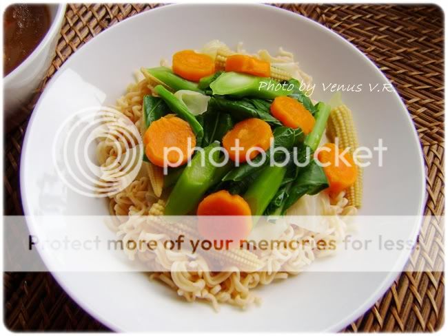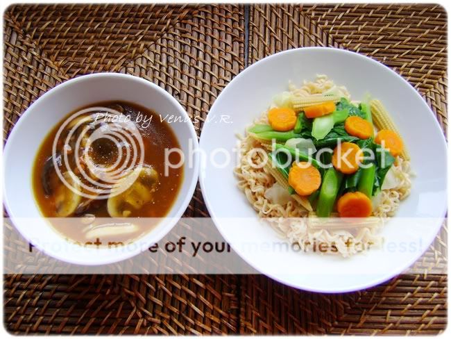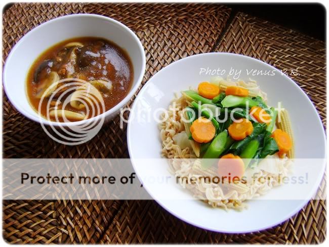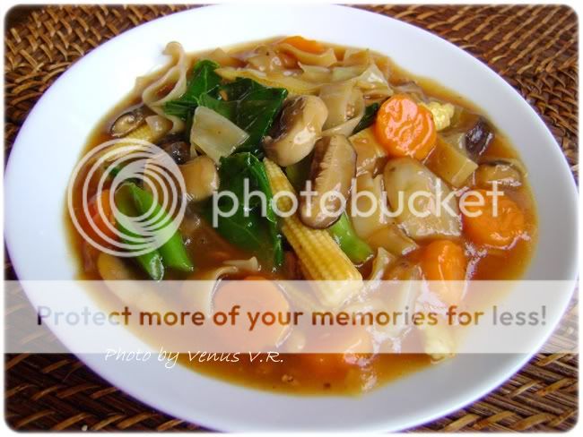 ช่วงนี้เป็นช่วงเทศกาลกินเจ วันนี้เลยถือเอาเมนูเจมาฝากคะ เป็นรวมมิตรเจที่ จขบ. เคยได้ทำทานเมื่อปีที่แล้ว แต่ขอรวมเป็นภาค ๆ นะคะ เพราะแต่ละเมนูรูปไม่ค่อยเยอะมาก เลยเอามารวมกันเลยดีกว่า ปีนี้ก็ตั้งใจจะทานเหมือนกันคะ แต่อาจไม่ครบวัน ปี 2009 ถือเป็นปีแรกเลยที่คิดจะกินเจ ปกติไม่เคยทำกับเขาหรอกคะ จำได้ว่าเคยลองกินเองที่เมืองไทย ไม่ถึง 2 วัน เจแตกซะแล้ว แต่ปีที่แล้ว อยากลองทานดู เนื่องจาก จขบ. ไม่ค่อยได้ไปวัดที่เบลเยียมเท่าไหร่ ก็เลยคิดว่า ลองกินเจดู น่าจะได้บุญกับเขาบ้าง และเผื่อผลบุญนี้ให้กับปา-พ่อสามีที่เสียชีวิตไปเมื่อต้นปีที่แล้วอีกด้วย เท่าที่ทราบ อาหารเจ เป็นอาหารที่ปรุงจากพืชผักและไม่มีเนื้อสัตว์ปน อีกทั้งต้องไม่ปรุงด้วย ผักฉุนทั้ง 5 อย่าง ซึ่งได้แก่ กระเทียม หัวหอม หลักเกียว กุ้ยฉ่าย และใบยาสูบ แต่ จขบ. ลองไปอ่านบางเว็บ เขาห้ามผักชีด้วย อาหารเจปี 2009 มีบางเมนูใส่ผักชีด้วยนะคะ เช่นต้มยำเห็ดเจน้ำใสและยำวุ้นส้นเจ แต่ จขบ. กินช่วงก่อนเทศกาลกินเจ เลยถือว่าไม่ผิดกติกาแต่อย่างใดว่าไหมคะ แต่ยังไง ก็จะเอามาให้ดูกันคะ คราวนี้ลง 2 เมนูก่อนเลยคะปล. จขบ. ไม่ใช่ Expert อาหารเจนะคะ ผิดถูกยังไง ต้องขออภัยไว้ ณ ที่นี้ด้วยคะราดหน้า 6 สหาย ทานพร้อมเส้นใหญ่และมาม่า เครื่องปรุง คะน้าหั่น ข้าวโพดอ่อนผ่าซีก แครอทปอกเปลือก หั่นแว่น กระหล่ำปลีหั่นซีก (อันนี้เป็นความชอบส่วนตัว จะไม่ลวกแล้วใส่สดตอนทำน้ำราดเลยก็ได้คะ) เห็ดแชมปิยอง ปัดเศษดินที่ติดอยู่กับเห็ดออก (ห้ามล้างน้ำ) ผ่าครึ่งหรือสามส่วน เห็ดหอม แช่น้ำจนนุ่น หั่นชิ้นพอคำ (น้ำแช่เห็ดหอมอย่าทิ้งนะคะ สามารถใส่ไปในน้ำทำราดหน้าคะ) เส้นใหญ่และมาม่า กระเทียมสับ น้ำมันมะกอก น้ำเปล่า คนอร์เห็ดหอมหรือคนอร์ผัก เต้าเจี้ยว แป้งข้าวโพด (ใช้แป้งมันก็ได้คะ แต่บ้านนี้ใช้แป้งข้าวโพดตลอด เพราะหาง่ายกว่า) ซอสหอยนางรมมังฯ ซีอิ้วขาว น้ำตาลทราย เกลือ ซีอิ้วดำ (ไว้คลุกเส้นใหญ่) พริกไทยป่น ไว้โรยหน้าตอนราดน้ำราดหน้าแล้ว พริกน้ำส้ม พริกป่น ซีอิ้วขาว น้ำตาลทราย (เครื่องปรุง) วิธีทำ 1. ตั้งหม้อใส่น้ำและเหยาะเกลือลงไปเล็กน้อย พอน้ำเดือด ลวกคะน้า ข้าวโพดอ่อน แครอท และกระหล่ำปลีหั่นซีก จนพอสุก (อันนี้เป็นความชอบส่วนตัว จะไม่ลวกแล้วใส่สดตอนทำน้ำราดเลยก็ได้คะ) แล้วตักแช่ในน้ำเย็น เพื่อให้สีของผักคงสีสวย จากนั้นก็ลวกมาม่าในน้ำร้อน ต้มเส้นใหญ่จนสุกและคลุกเส้นกับซีอิ้วดำ จากน้ำก็นำเส้นใหญ่ไปผัดกับน้ำมันมะกอกให้พอหอม ตักใส่จานแยกไว้ 2. เริ่มทำน้ำราดหน้า โดยตั้งกระทะใส่น้ำมันมะกอกลงไป พ