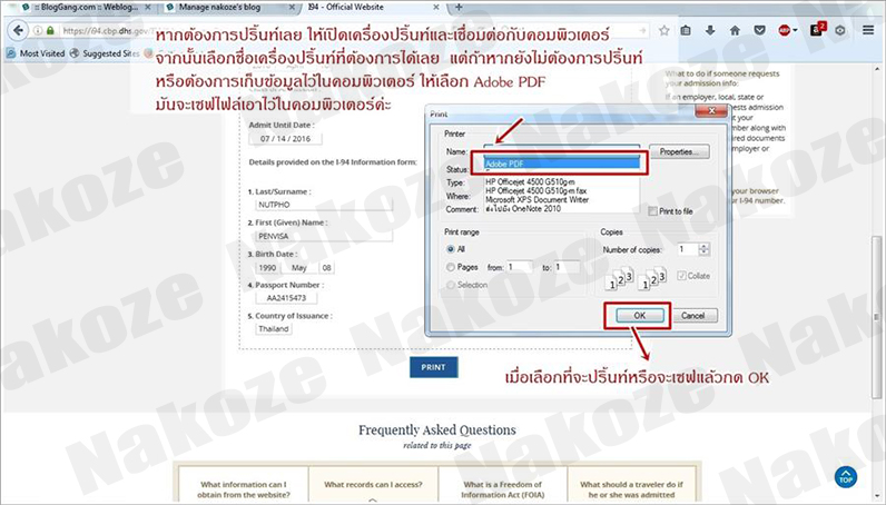 6. ถ้าหากต้องการปริ้นท์ออกมาต่อเครื่องปริ้นท์เข้ากับคอมพิวเตอร์ จากนั้นเลือกชื่อเครื่องปริ้นท์ที่ต่อไว้แล้วกด Ok ถ้าหากต้องการเซฟข้อมูลเก็บไว้ในคอมพิวเตอร์ให้กด Adobe PDF แล้วกด OK มันจะเซฟเป็น PDF file ลงคอมพิวเตอร์ไว้