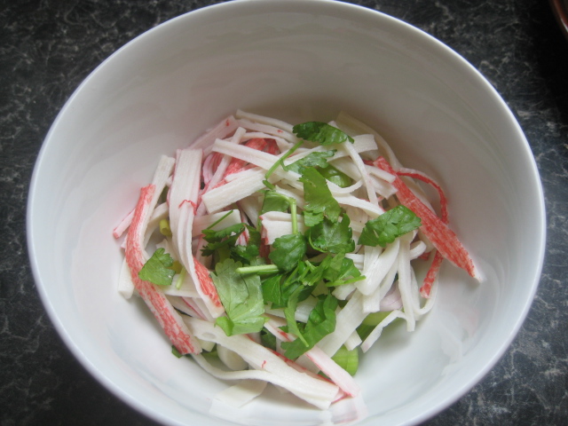 วิธีทำ ปูอัดฉีกเป็นเส้น หั่นซอยพริกยวก หอมแดง ต้นหอมและผักชี