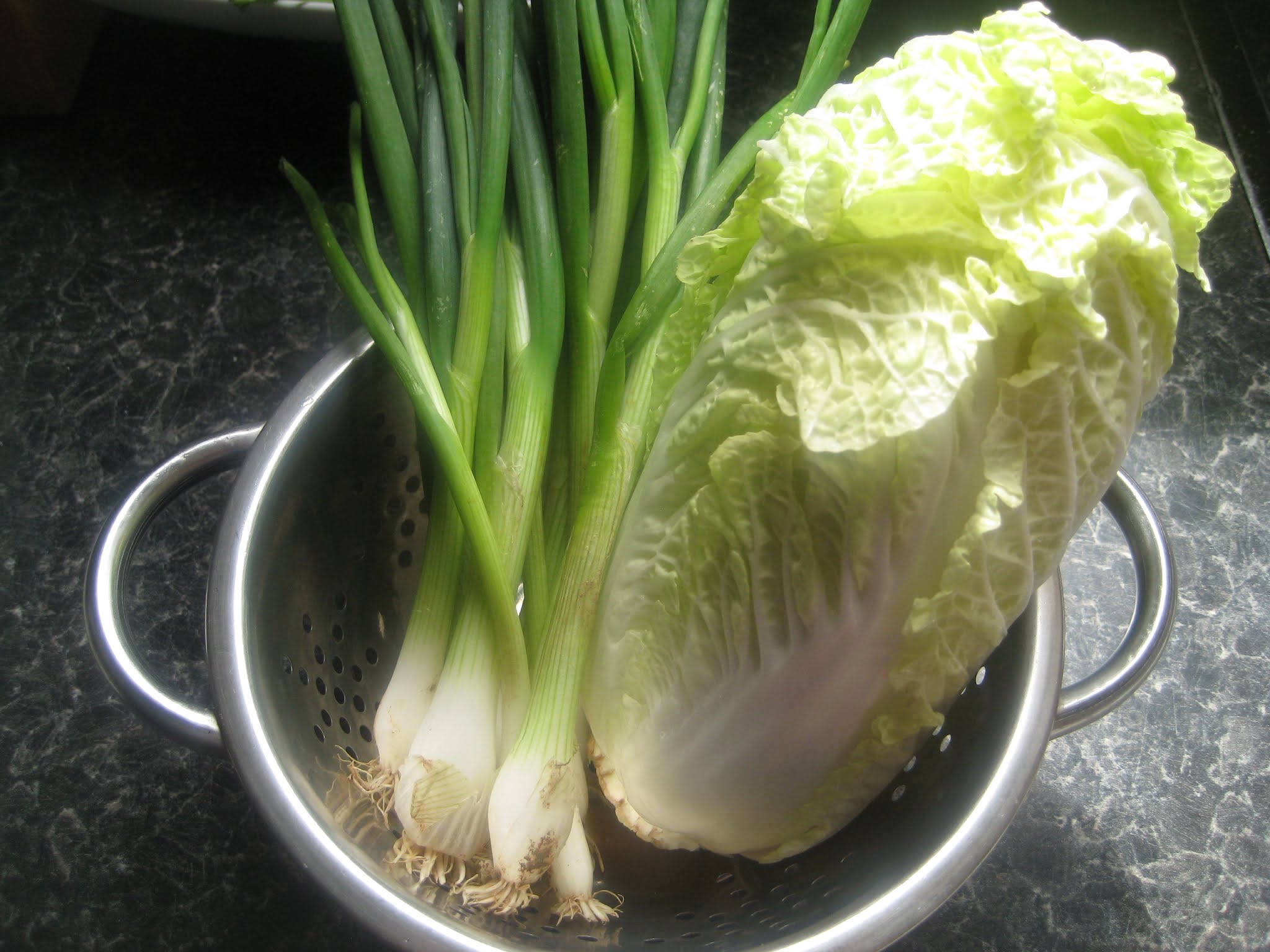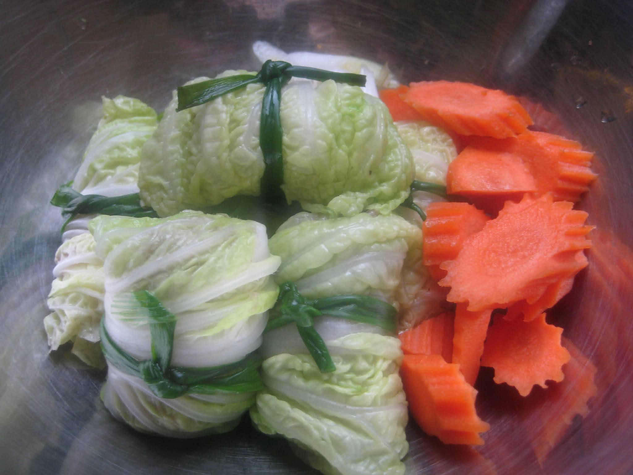 ผักกาดขาวแกะเป็นใบ สไลด์ส่วนก้านตรงหนา ๆ ออกแล้วนำไปลวกในน้ำเดือด แค่พอนิ่ม ตักขึ้นพักให้สะเด็ดน้ำลวกต้นหอมใช้ สำหรับมัด หั่นแครอท ห่อไส้หมูสับกับใบผักกาดขาวและมัดด้วยใบต้นหอมลวก